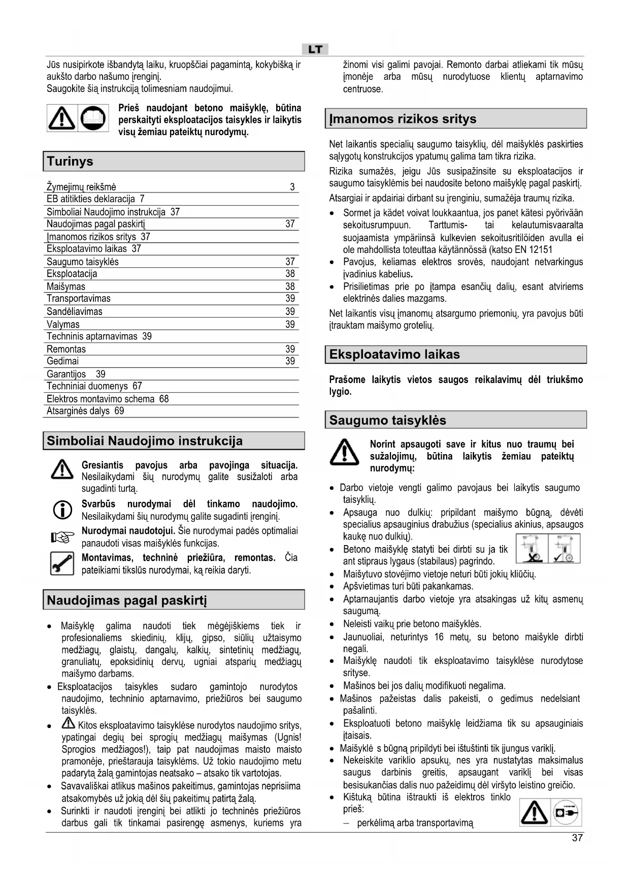 Παρακαλούμε, προσέξτε την συνημμένη δήλωση εγγύησης.37 Jūs nusipirkote išbandytą laiku, kruopščiai pagamintą, kokybišką ir aukšto darbo našumo įrenginį. Saugokite šią instrukciją tolimesniam naudojimui. Prieš naudojant betono maišyklę, būtina perskaityti eksploatacijos taisykles ir laikytis visų žemiau pateiktų nurodymų.