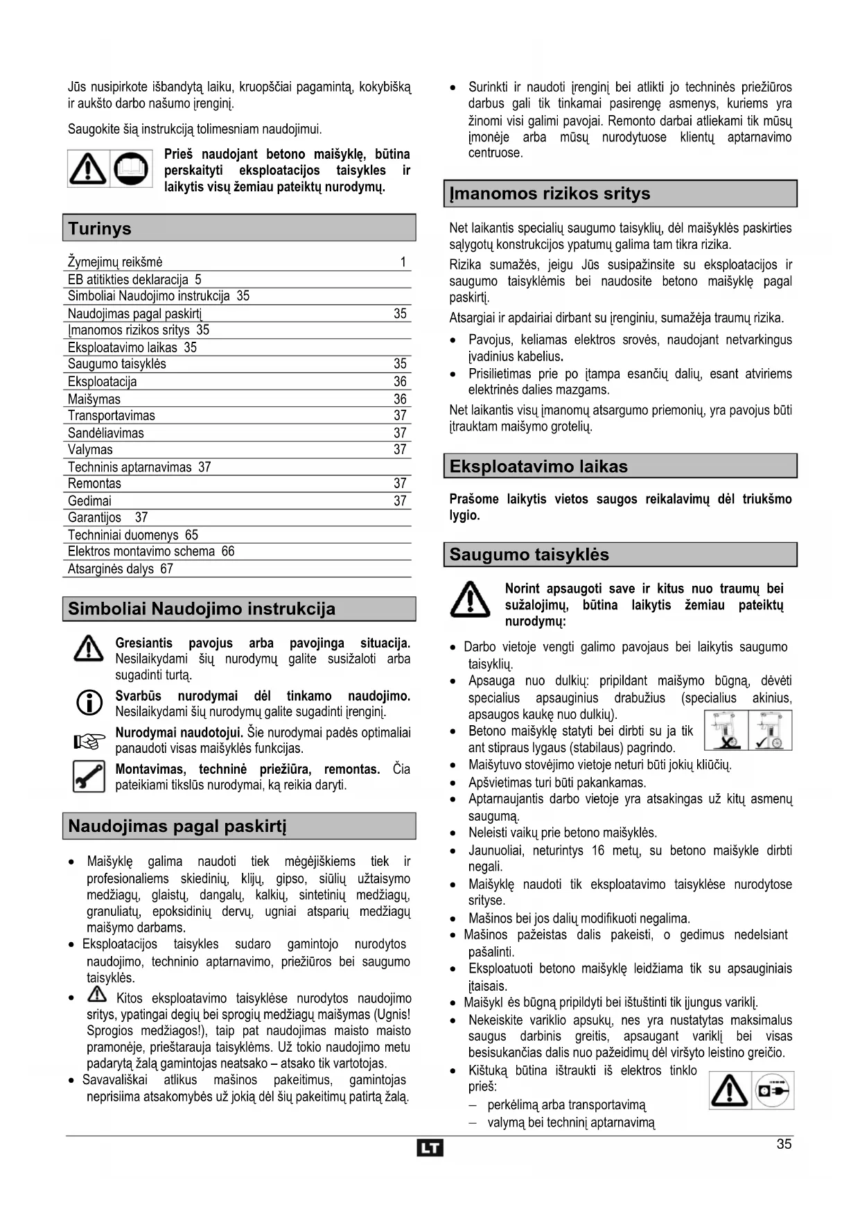 Παρακαλούμε, προσέξτε την συνημμένη δήλωση εγγύησης.35 Jūs nusipirkote išbandytą laiku, kruopščiai pagamintą, kokybišką ir aukšto darbo našumo įrenginį. Saugokite šią instrukciją tolimesniam naudojimui. Prieš naudojant betono maišyklę, būtina perskaityti eksploatacijos taisykles ir laikytis visų žemiau pateiktų nurodymų.