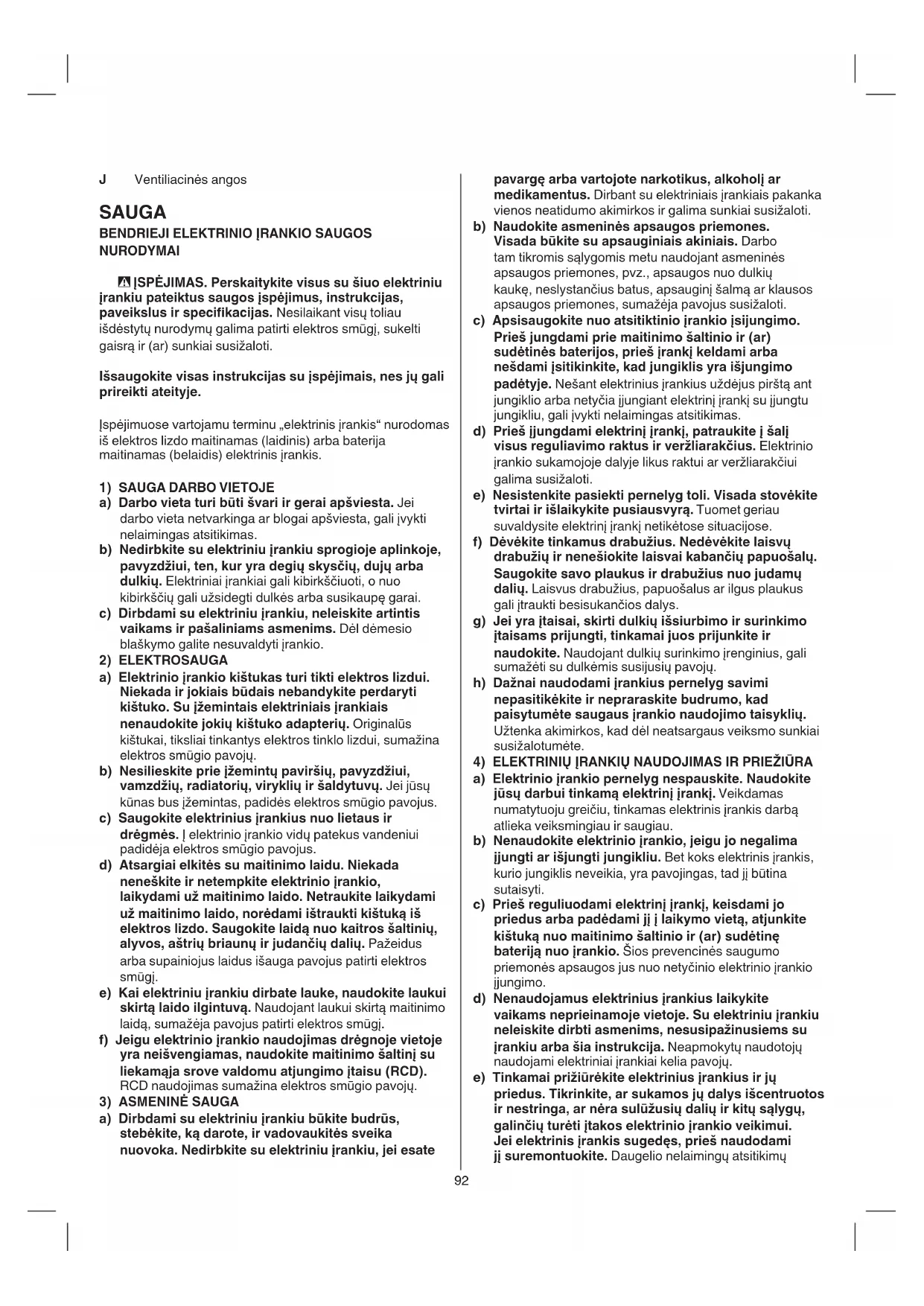 a) Elektrinioįrankiopernelygnespauskite.Naudokite jūsųdarbuitinkamąelektrinįįrankį. Veikdamas numatytuoju greičiu, tinkamas elektrinis įrankis darbą atlieka veiksmingiau ir saugiau. b) Nenaudokiteelektrinioįrankio,jeigujonegalima įjungtiarišjungtijungikliu. Bet koks elektrinis įrankis, kurio jungiklis neveikia, yra pavojingas, tad jį būtina sutaisyti. c) Priešreguliuodamielektrinįįrankį,keisdamijo priedusarbapadėdamijįįlaikymovietą,atjunkite kištukąnuomaitinimošaltinioir(ar)sudėtinę baterijąnuoįrankio. Šios prevencinės saugumo priemonės apsaugos jus nuo netyčinio elektrinio įrankio įjungimo. d) Nenaudojamuselektriniusįrankiuslaikykite vaikamsneprieinamojevietoje.Suelektriniuįrankiu neleiskitedirbtiasmenims,nesusipažinusiemssu įrankiuarbašiainstrukcija. Neapmokytų naudotojų naudojami elektriniai įrankiai kelia pavojų. e) Tinkamaiprižiūrėkiteelektriniusįrankiusirjų priedus.Tikrinkite,arsukamosjųdalysišcentruotos irnestringa,arnėrasulūžusiųdaliųirkitųsąlygų, galinčiųturėtiįtakoselektrinioįrankioveikimui. Jeielektrinisįrankissugedęs,priešnaudodami jįsuremontuokite. Daugelio nelaimingų atsitikimų J Ventiliacinės angos SAUGA BENDRIEJIELEKTRINIOĮRANKIOSAUGOS NURODYMAI - ĮSPĖJIMAS.Perskaitykitevisussušiuoelektriniu įrankiupateiktussaugosįspėjimus,instrukcijas, paveikslusirspecikacijas.Nesilaikant visų toliau išdėstytų nurodymų galima patirti elektros smūgį, sukelti gaisrą ir (ar) sunkiai susižaloti. Išsaugokitevisasinstrukcijassuįspėjimais,nesjųgali prireikti ateityje. Įspėjimuose vartojamu terminu „elektrinis įrankis“ nurodomas iš elektros lizdo maitinamas (laidinis) arba baterija maitinamas (belaidis) elektrinis įrankis.