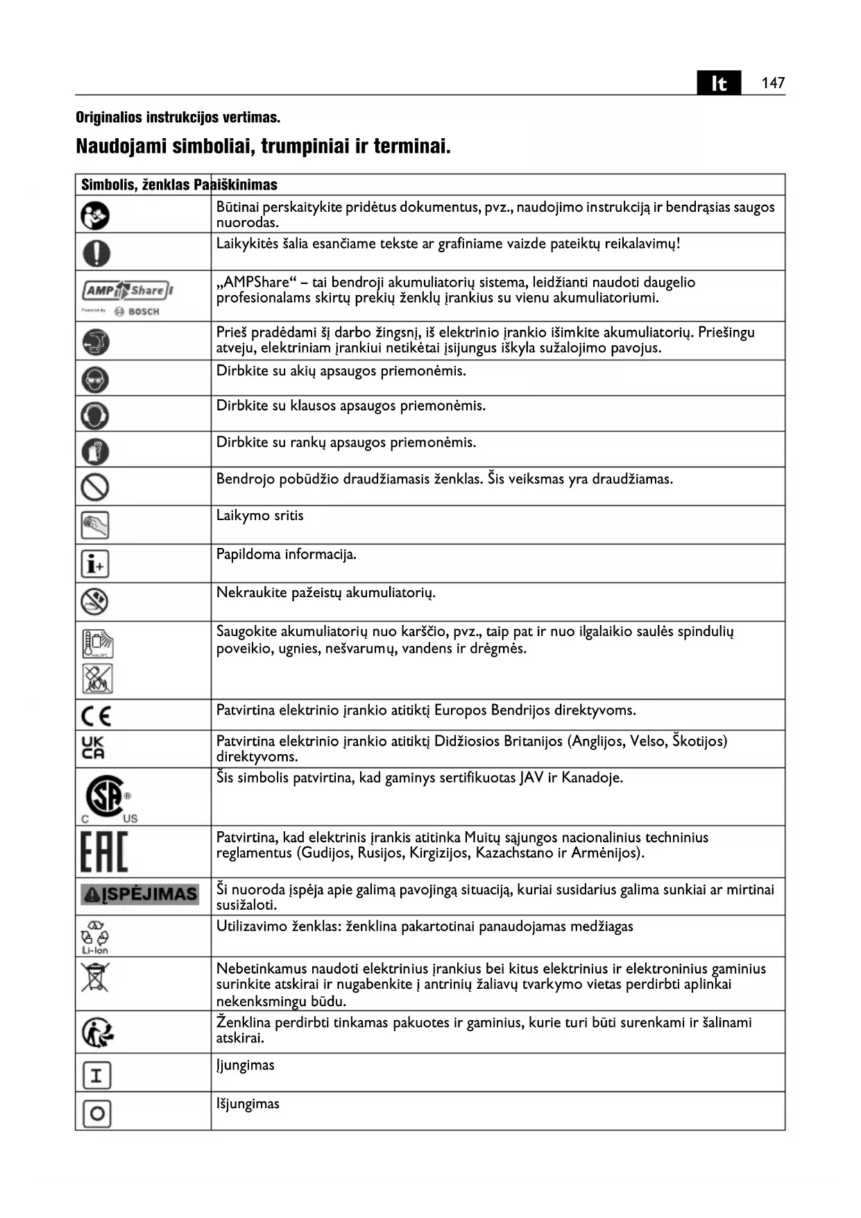 Originalios instrukcijos vertimas. Naudojami simboliai, trumpiniai ir terminai. Simbolis, ženklas Paaiškinimas Būtinai perskaitykite pridėtus dokumentus, pvz., naudojimo instrukciją ir bendrąsias saugos nuorodas. Laikykitės šalia esančiame tekste ar grafiniame vaizde pateiktų reikalavimų! „AMPShare“ – tai bendroji akumuliatorių sistema, leidžianti naudoti daugelio profesionalams skirtų prekių ženklų įrankius su vienu akumuliatoriumi. Prieš pradėdami šį darbo žingsnį, iš elektrinio įrankio išimkite akumuliatorių. Priešingu atveju, elektriniam įrankiui netikėtai įsijungus iškyla sužalojimo pavojus. Dirbkite su akių apsaugos priemonėmis. Dirbkite su klausos apsaugos priemonėmis. Dirbkite su rankų apsaugos priemonėmis. Bendrojo pobūdžio draudžiamasis ženklas. Šis veiksmas yra draudžiamas. Laikymo sritis Papildoma informacija. Nekraukite pažeistų akumuliatorių. Saugokite akumuliatorių nuo karščio, pvz., taip pat ir nuo ilgalaikio saulės spindulių poveikio, ugnies, nešvarumų, vandens ir drėgmės. Patvirtina elektrinio įrankio atitiktį Europos Bendrijos direktyvoms. Patvirtina elektrinio įrankio atitiktį Didžiosios Britanijos (Anglijos, Velso, Škotijos) direktyvoms. Šis simbolis patvirtina, kad gaminys sertifikuotas JAV ir Kanadoje. Patvirtina, kad elektrinis įrankis atitinka Muitų sąjungos nacionalinius techninius reglamentus (Gudijos, Rusijos, Kirgizijos, Kazachstano ir Armėnijos). Ši nuoroda įspėja apie galimą pavojingą situaciją, kuriai susidarius galima sunkiai ar mirtinai susižaloti. Utilizavimo ženklas: ženklina pakartotinai panaudojamas medžiagas Nebetinkamus naudoti elektrinius įrankius bei kitus elektrinius ir elektroninius gaminius surinkite atskirai ir nugabenkite į antrinių žaliavų tvarkymo vietas perdirbti aplinkai nekenksmingu būdu. Ženklina perdirbti tinkamas pakuotes ir gaminius, kurie turi būti surenkami ir šalinami atskirai. Įjungimas Išjungimas max.50°C148