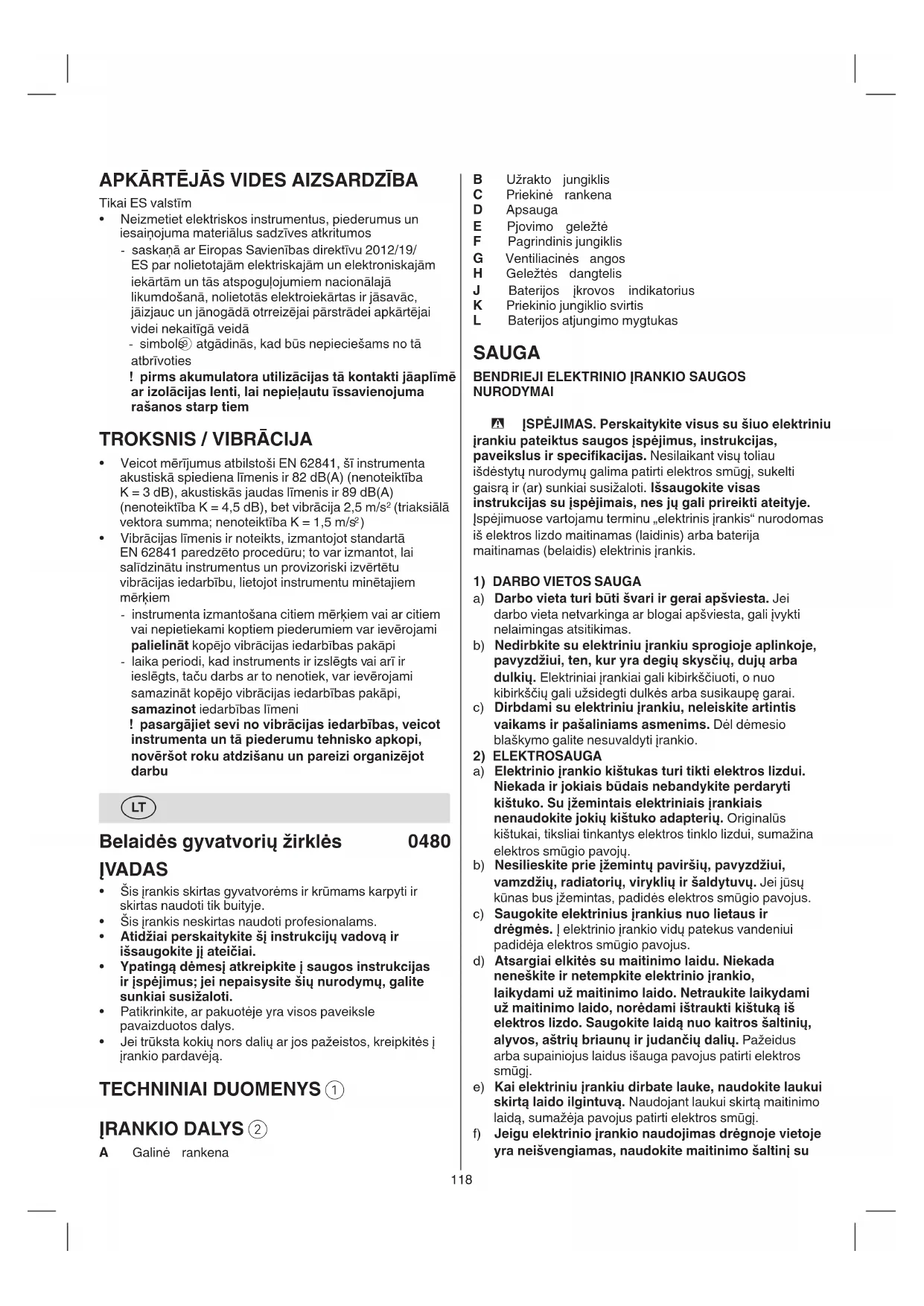 J Baterijos įkrovos indikatorius K Priekinio jungiklio svirtis L Baterijos atjungimo mygtukas SAUGA