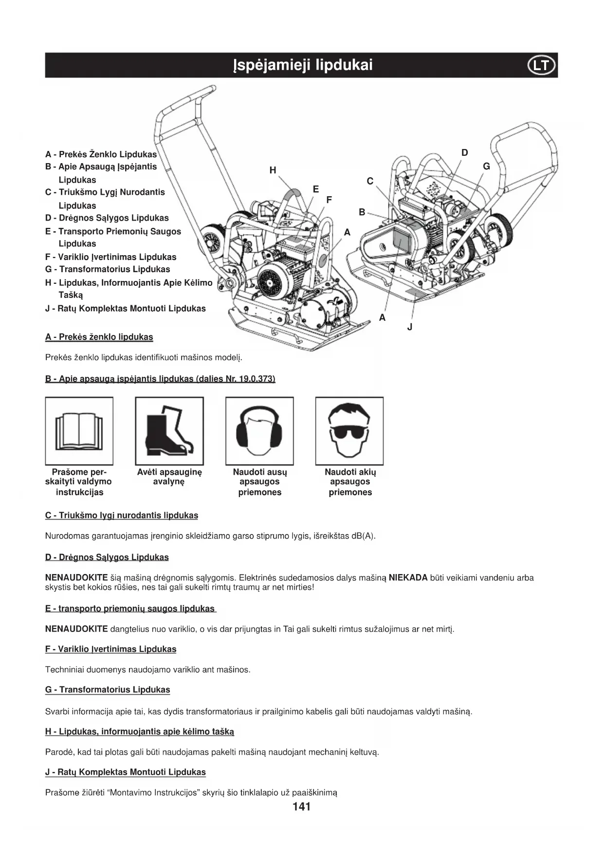 A - Prekơs ženklo lipdukas Prekơs ženklo lipdukas identi¿ kuoti mašinos modelƳ. B - Apie apsaugą Ƴspơjantis lipdukas (dalies Nr. 19.0.373) Prašome per- skaityti valdymo instrukcijas Avơti apsauginĊ avalynĊ Naudoti ausǐ apsaugos priemones Naudoti akiǐ apsaugos priemones C - Triukšmo lygƳ nurodantis lipdukas Nurodomas garantuojamas Ƴrenginio skleidžiamo garso stiprumo lygis, išreikštas dB(A). D - Drơgnos Sąlygos Lipdukas NENAUDOKITE šią mašiną drơgnomis sąlygomis. Elektrinơs sudedamosios dalys mašiną NIEKADA bnjti veikiami vandeniu arba skystis bet kokios rnjšies, nes tai gali sukelti rimtǐ traumǐ ar net mirties! E - transporto priemoniǐ saugos lipdukas NENAUDOKITE dangtelius nuo variklio, o vis dar prijungtas in Tai gali sukelti rimtus sužalojimus ar net mirtƳ. F - Variklio Ʋvertinimas Lipdukas Techniniai duomenys naudojamo variklio ant mašinos. G - Transformatorius Lipdukas Svarbi informacija apie tai, kas dydis transformatoriaus ir prailginimo kabelis gali bnjti naudojamas valdyti mašiną. H - Lipdukas, informuojantis apie kơlimo tašką Parodơ, kad tai plotas gali bnjti naudojamas pakelti mašiną naudojant mechaninƳ keltuvą. J - Ratǐ Komplektas Montuoti Lipdukas Prašome žinjrơti “Montavimo Instrukcijos” skyriǐ šio tinklalapio už paaiškinimą Ʋspơjamieji lipdukai
