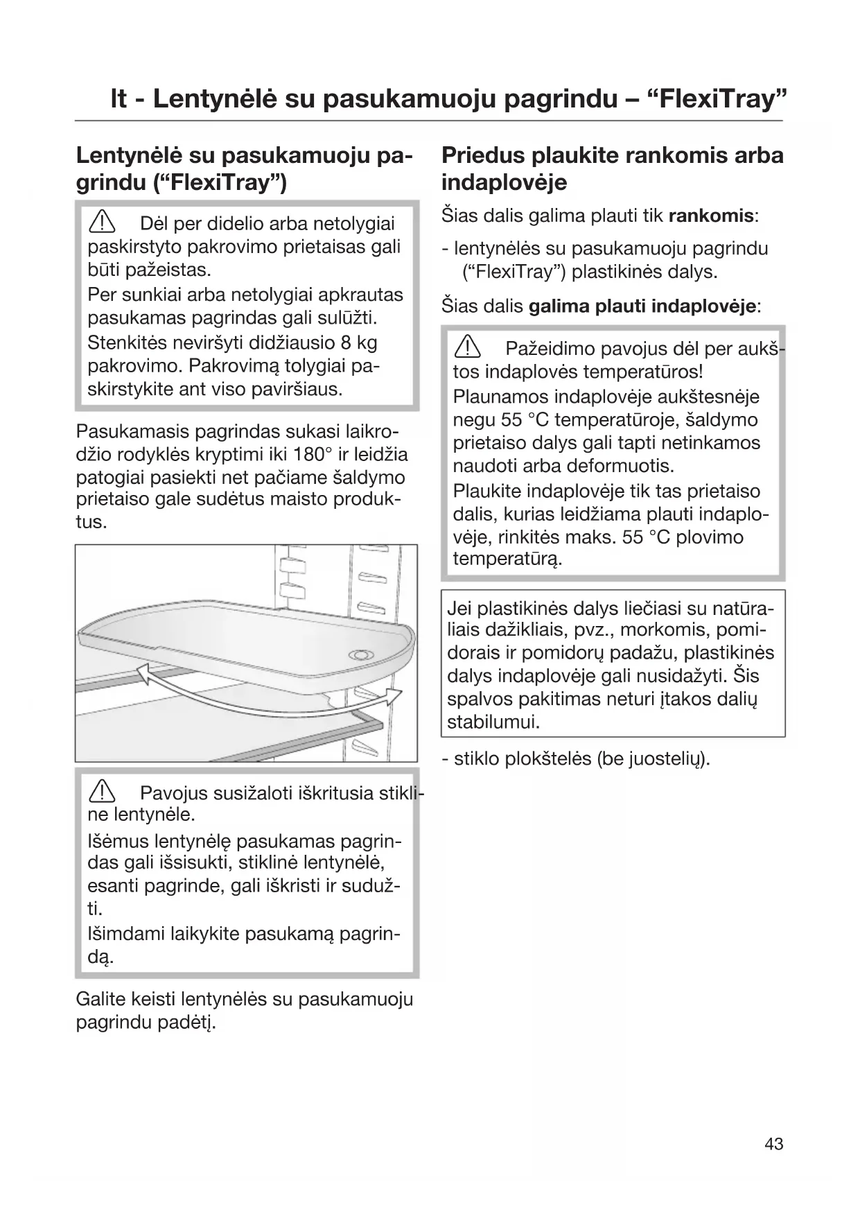 Lentynėlė su pasukamuoju pa- grindu (“FlexiTray”) Dėl per didelio arba netolygiai paskirstyto pakrovimo prietaisas gali būti pažeistas. Per sunkiai arba netolygiai apkrautas pasukamas pagrindas gali sulūžti. Stenkitės neviršyti didžiausio 8kg pakrovimo. Pakrovimą tolygiai pa- skirstykite ant viso paviršiaus. Pasukamasis pagrindas sukasi laikro- džio rodyklės kryptimi iki 180° ir leidžia patogiai pasiekti net pačiame šaldymo prietaiso gale sudėtus maisto produk- tus. Pavojus susižaloti iškritusia stikli- ne lentynėle. Išėmus lentynėlę pasukamas pagrin- das gali išsisukti, stiklinė lentynėlė, esanti pagrinde, gali iškristi ir suduž- ti. Išimdami laikykite pasukamą pagrin- dą. Galite keisti lentynėlės su pasukamuoju pagrindu padėtį. Priedus plaukite rankomis arba indaplovėje Šias dalis galima plauti tik rankomis: - lentynėlės su pasukamuoju pagrindu (“FlexiTray”) plastikinės dalys. Šias dalis galima plauti indaplovėje: Pažeidimo pavojus dėl per aukš- tos indaplovės temperatūros! Plaunamos indaplovėje aukštesnėje negu 55°C temperatūroje, šaldymo prietaiso dalys gali tapti netinkamos naudoti arba deformuotis. Plaukite indaplovėje tik tas prietaiso dalis, kurias leidžiama plauti indaplo- vėje, rinkitės maks. 55°C plovimo temperatūrą. Jei plastikinės dalys liečiasi su natūra- liais dažikliais, pvz., morkomis, pomi- dorais ir pomidorų padažu, plastikinės dalys indaplovėje gali nusidažyti. Šis spalvos pakitimas neturi įtakos dalių stabilumui. - stiklo plokštelės (be juostelių).lt - Lentynėlė su pasukamuoju pagrindu – “FlexiTray”