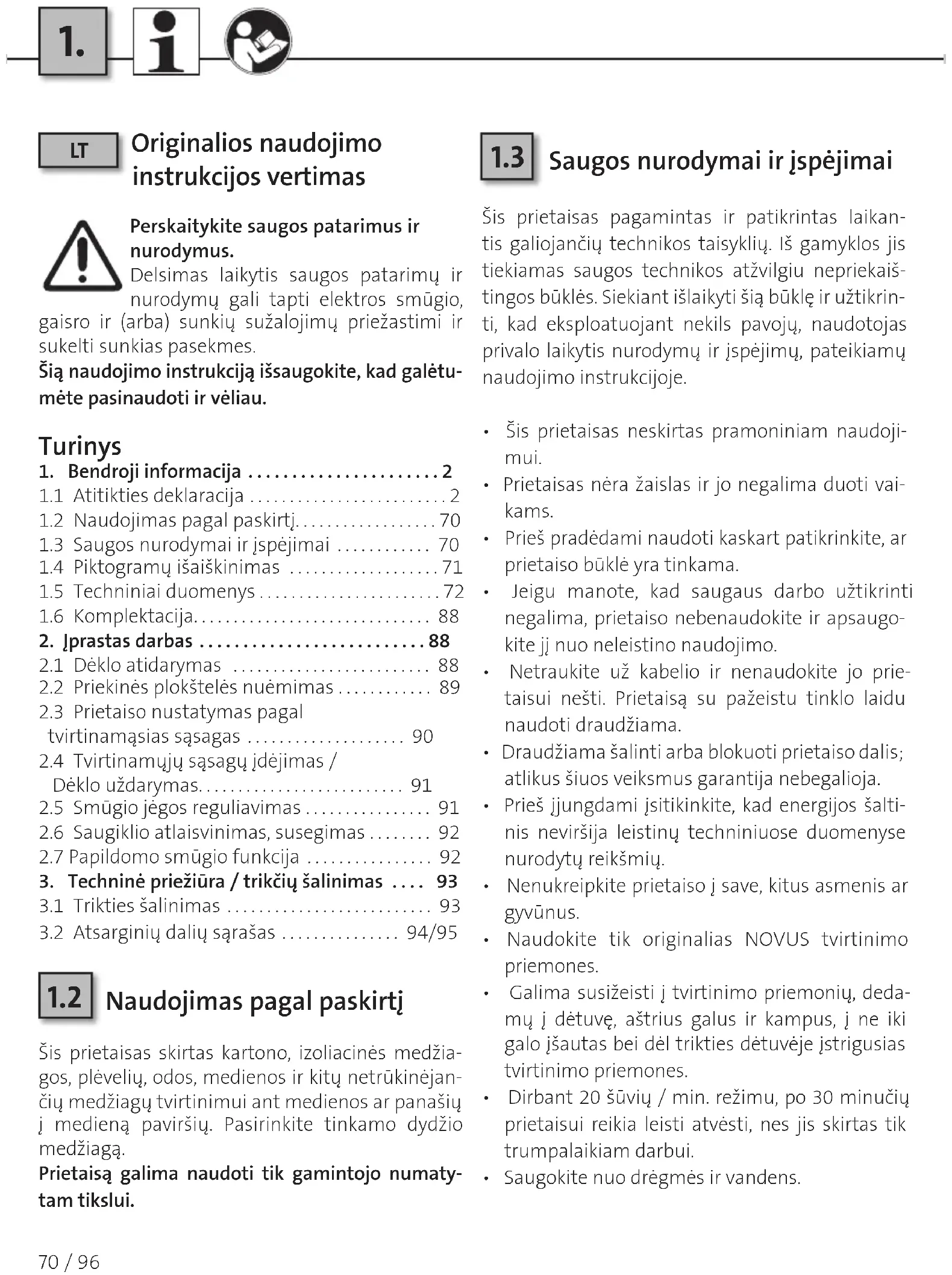 . Atitikties deklaracija ......................... . Naudojimas pagal paskirtį.................. . Saugos nurodymai ir įspėjimai ............ . Piktogramų išaiškinimas ................... . Techniniai duomenys ....................... . Komplektacija..............................
