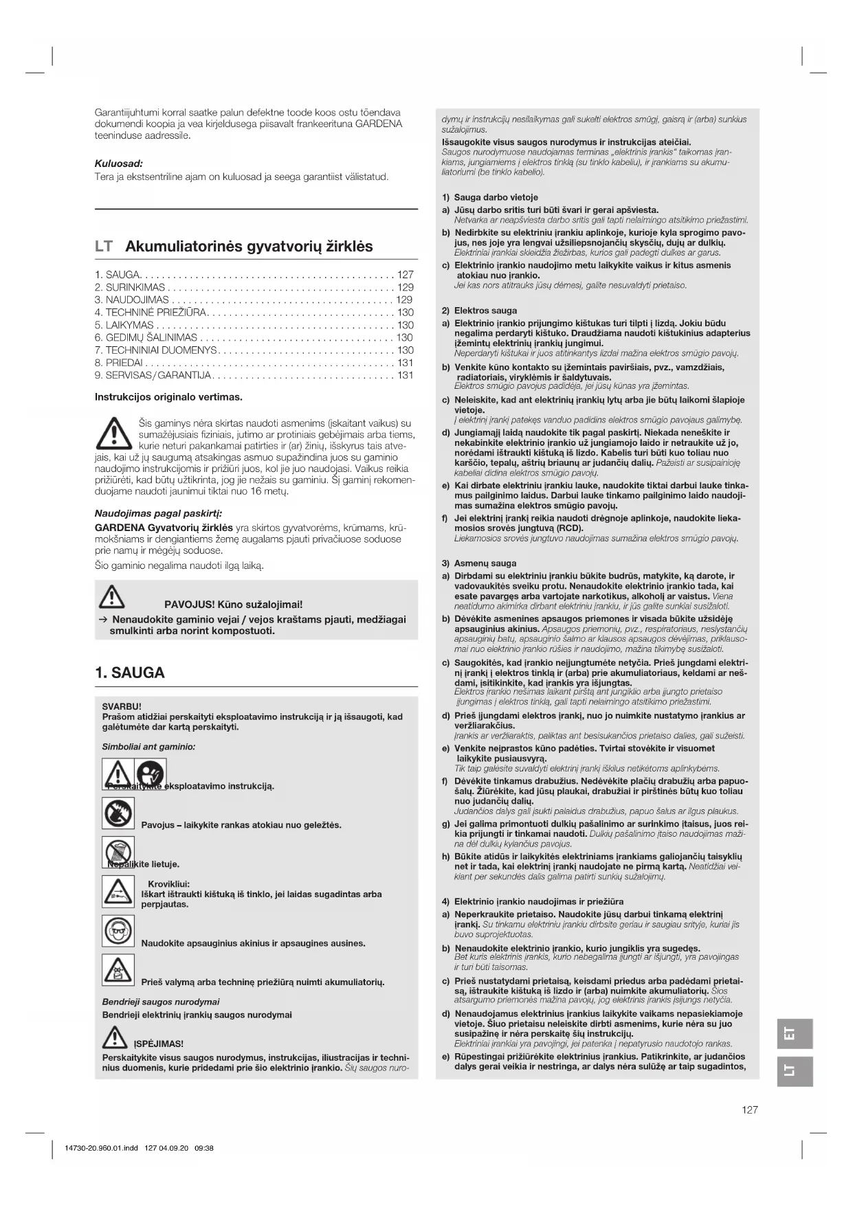 sausoje, uždaroje ir nuo šalnų apsaugotoje vietoje. Šalinimas: (pagal Direktyvą 2012/19/ES) Gaminio negalima šalinti su įprastomis buitinėmis atliekomis. Jį reikia šalinti pagal galiojančius vietinius aplinkosaugos reikalavi- mus. SVARBU! v Šalinkite gaminį vietiniame komunaliniame atliekų surinkimo ir perdir- bimo punkte. Akumuliatoriaus šalinimas: Li-ion GARDENA akumuliatoriuje yra ličio jonų elementų, kurie, pasi- baigus jų tarnavimo laikui, turi būti šalinami atskirai nuo įprastų buitinių atliekų. SVARBU! v Šalinkite akumuliatorius vietiniame komunaliniame atliekų surinkimo ir perdirbimo punkte.