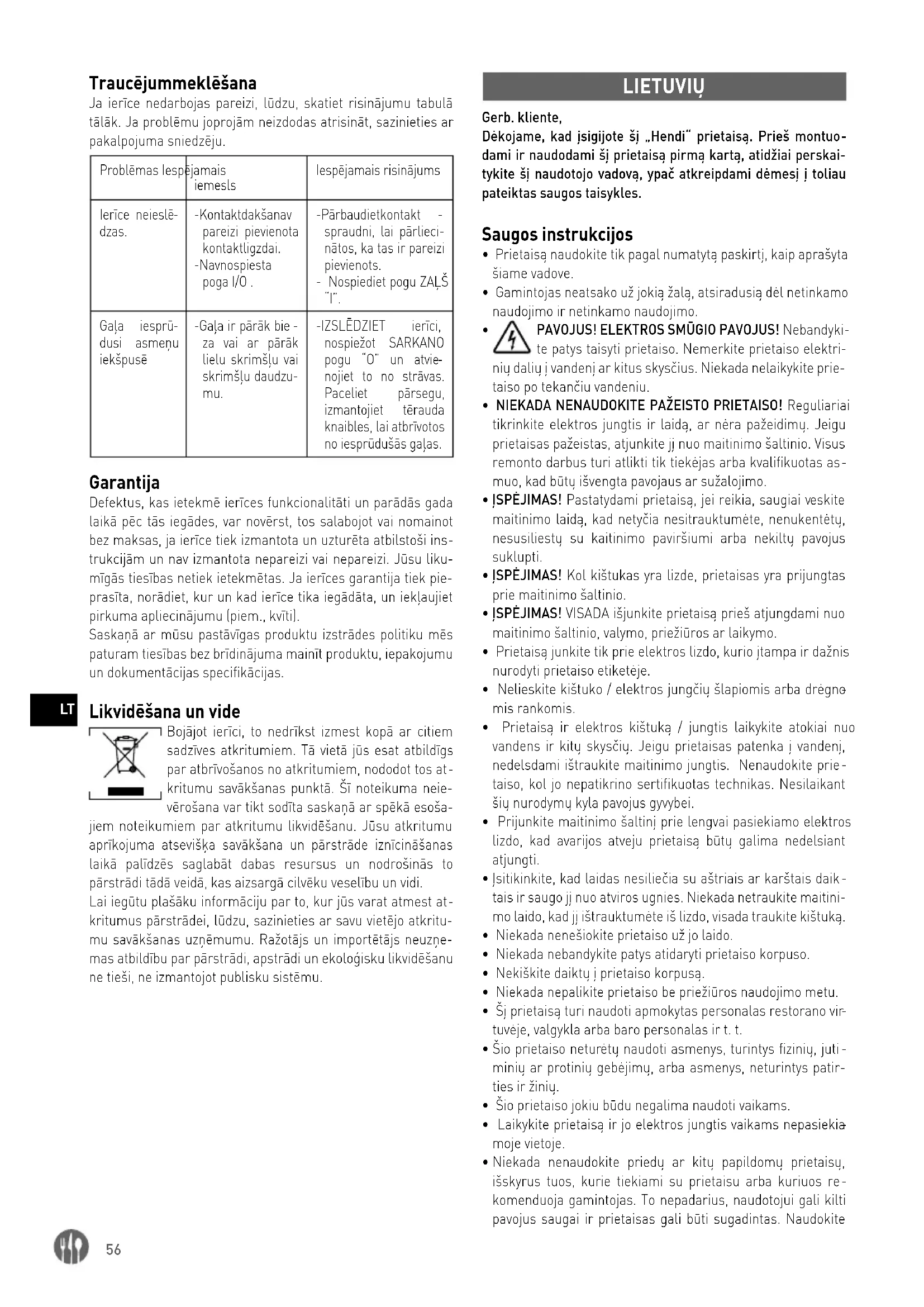 sią mėsą. Garantija Bet koks defektas, turintis įtakos prietaiso veikimui po vienerių metų nuo jo įsigijimo, bus pašalintas nemokamai jį pataisant arba pakeičiant, jeigu prietaisas buvo naudojamas ir prižiūri