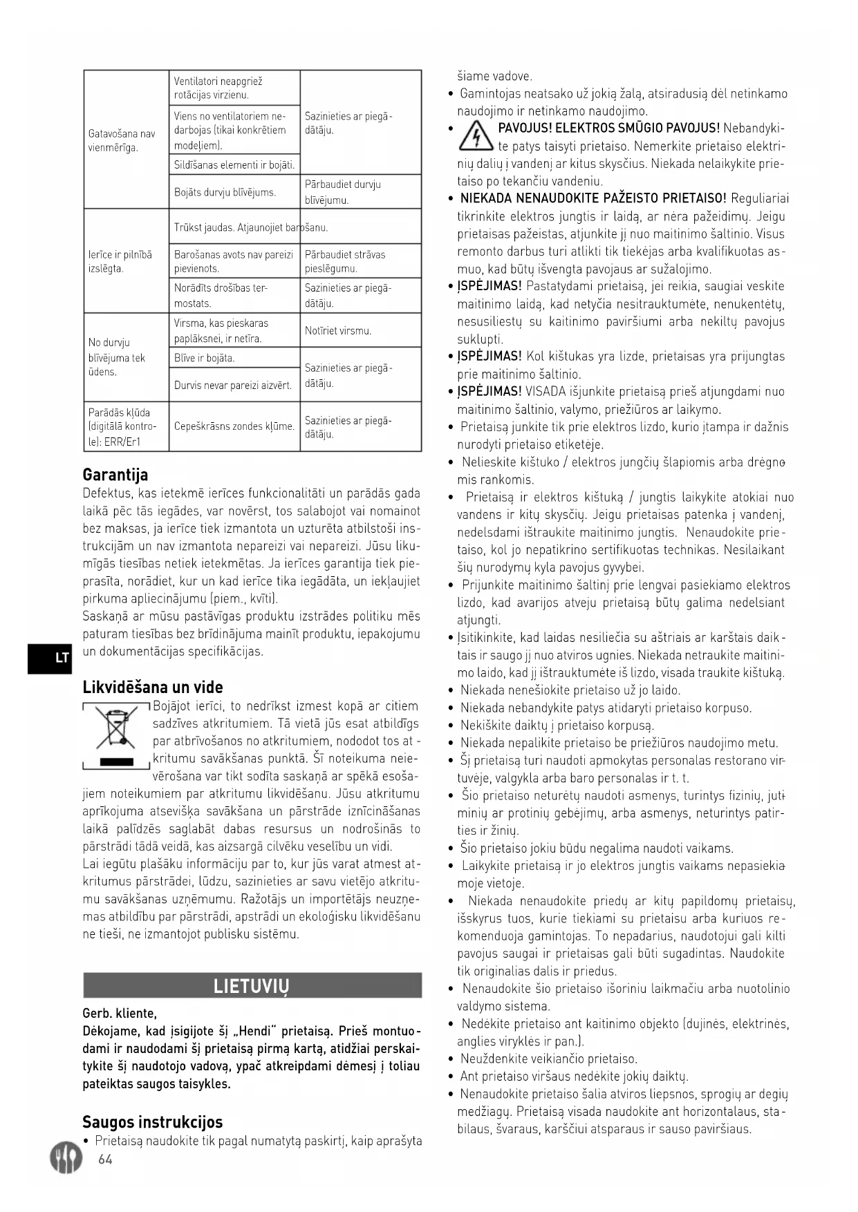 - Jeigu prietaisas nėra laikomas geros švaros būklės, tai gali neigiamai paveikti prietaiso veikimo trukmę ir sukelti pavo