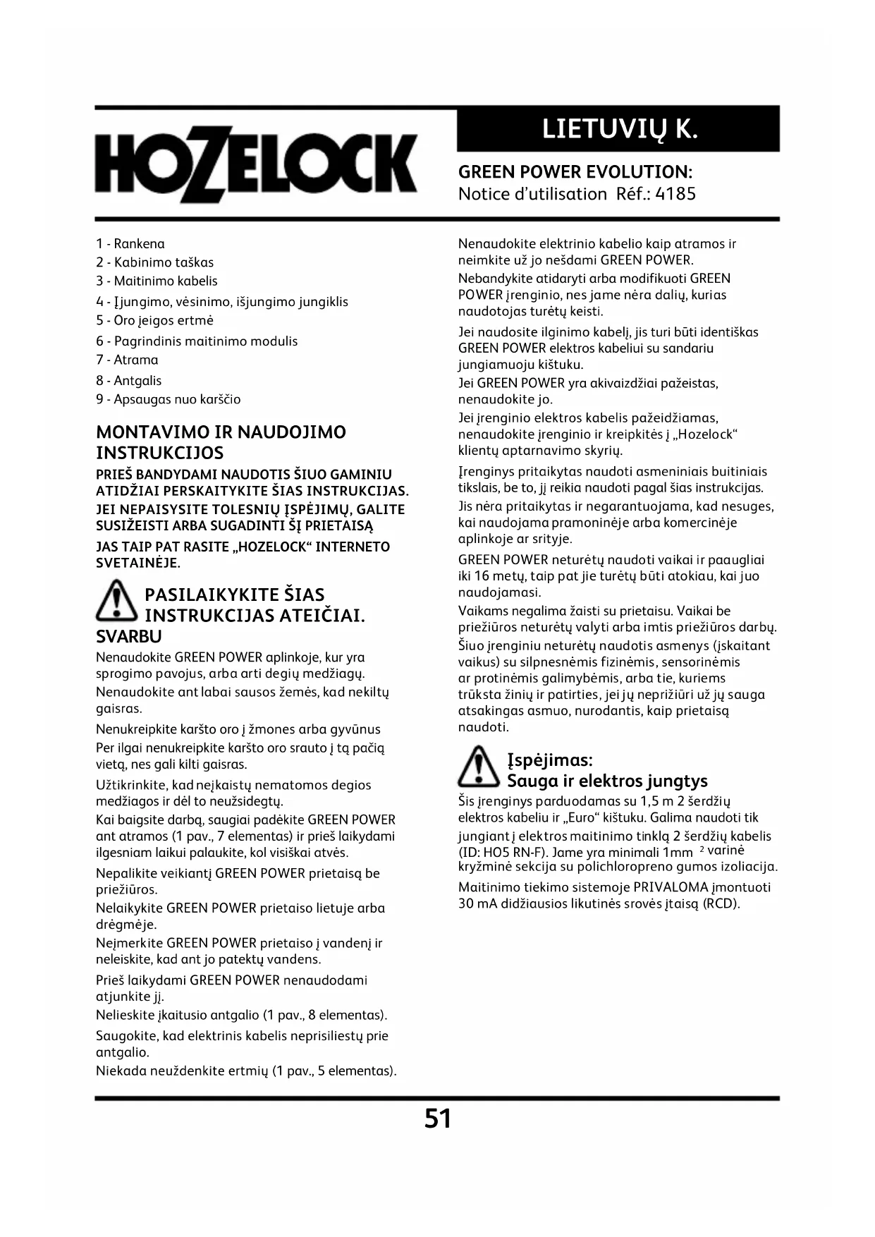 SVETAINĖJE. PASILAIKYKITE ŠIAS INSTRUKCIJAS ATEIČIAI. SVARBU Nenaudokite GREEN POWER aplinkoje, kur yra sprogimo pavojus, arba arti degių medžiagų. Nenaudokite ant labai sausos žemės, kad nekiltų gaisras. Nenukreipkite karšto oro į žmones arba gyvūnus Per ilgai nenukreipkite karšto oro srauto į tą pačią vietą, nes gali kilti gaisras. Užtikrinkite, kad neįkaistų nematomos degios medžiagos ir dėl to neužsidegtų. Kai baigsite darbą, saugiai padėkite GREEN POWER ant atramos (1 pav., 7 elementas) ir prieš laikydami ilgesniam laikui palaukite, kol visiškai atvės. Nepalikite veikiantį GREEN POWER prietaisą be priežiūros. Nelaikykite GREEN POWER prietaiso lietuje arba drėgmėje. Neįmerkite GREEN POWER prietaiso į vandenį ir neleiskite, kad ant jo patektų vandens. Prieš laikydami GREEN POWER nenaudodami atjunkite jį. Nelieskite įkaitusio antgalio (1 pav., 8 elementas). Saugokite, kad elektrinis kabelis neprisiliestų prie antgalio. Niekada neuždenkite ertmių (1 pav., 5 elementas). Nenaudokite elektrinio kabelio kaip atramos ir neimkite už jo nešdami GREEN POWER. Nebandykite atidaryti arba modifikuoti GREEN POWER įrenginio, nes jame nėra dalių, kurias naudotojas turėtų keisti. Jei naudosite ilginimo kabelį, jis turi būti identiškas GREEN POWER elektros kabeliui su sandariu jungiamuoju kištuku. Jei GREEN POWER yra akivaizdžiai pažeistas, nenaudokite jo. Jei įrenginio elektros kabelis pažeidžiamas, nenaudokite įrenginio ir kreipkitės į „Hozelock“ klientų aptarnavimo skyrių. Įrenginys pritaikytas naudoti asmeniniais buitiniais tikslais, be to, jį reikia naudoti pagal šias instrukcijas. Jis nėra pritaikytas ir negarantuojama, kad nesuges, kai naudojama pramoninėje arba komercinėje aplinkoje ar srityje. GREEN POWER neturėtų naudoti vaikai ir paaugliai iki 16 metų, taip pat jie turėtų būti atokiau, kai juo naudojamasi. Vaikams negalima žaisti su prietaisu. Vaikai be priežiūros neturėtų valyti arba imtis priežiūros darbų. Šiuo įrenginiu neturėtų naudotis asmenys (įskaitant vaikus) su silpnesnėmis fizinėmis, sensorinėmis ar protinėmis galimybėmis, arba tie, kuriems trūksta žinių ir patirties, jei jų neprižiūri už jų sauga atsakingas asmuo, nurodantis, kaip prietaisą naudoti. Įspėjimas: Sauga ir elektros jungtys Šis įrenginys parduodamas su 1,5 m 2 šerdžių elektros kabeliu ir „Euro“ kištuku. Galima naudoti tik jungiant į elektros maitinimo tinklą 2 šerdžių kabelis (ID: HO5 RN-F). Jame yra minimali 1mm