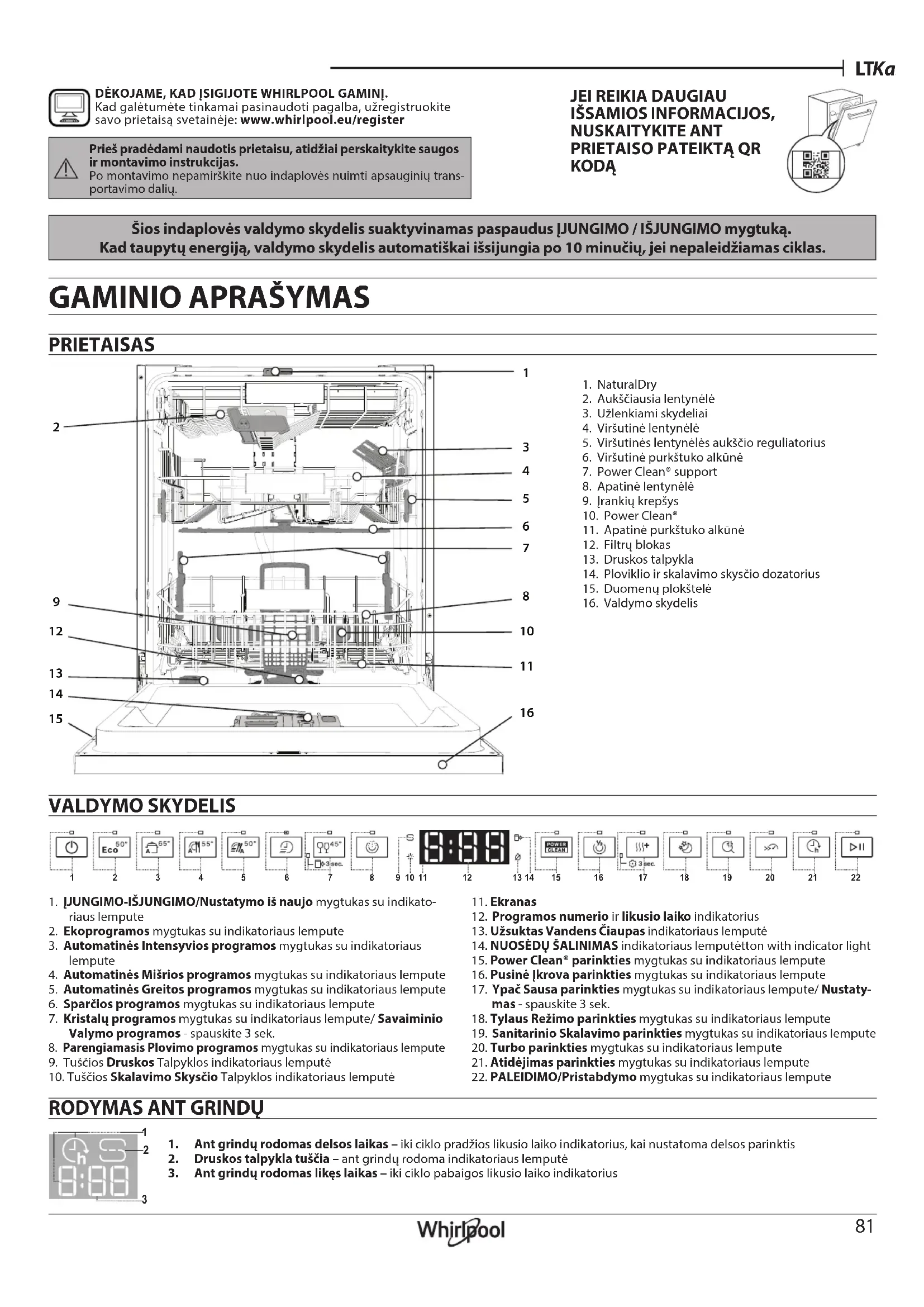 DĖKOJAME, KAD ĮSIGIJOTE WHIRLPOOL GAMINĮ. Kad galėtumėte tinkamai pasinaudoti pagalba, užregistruokite savo prietaisą svetainėje: www.whirlpool.eu/registerPrieš pradėdami naudotis prietaisu, atidžiai perskaitykite saugos ir montavimo instrukcijas.Po montavimo nepamirškite nuo indaplovės nuimti apsauginių trans-portavimo dalių.
