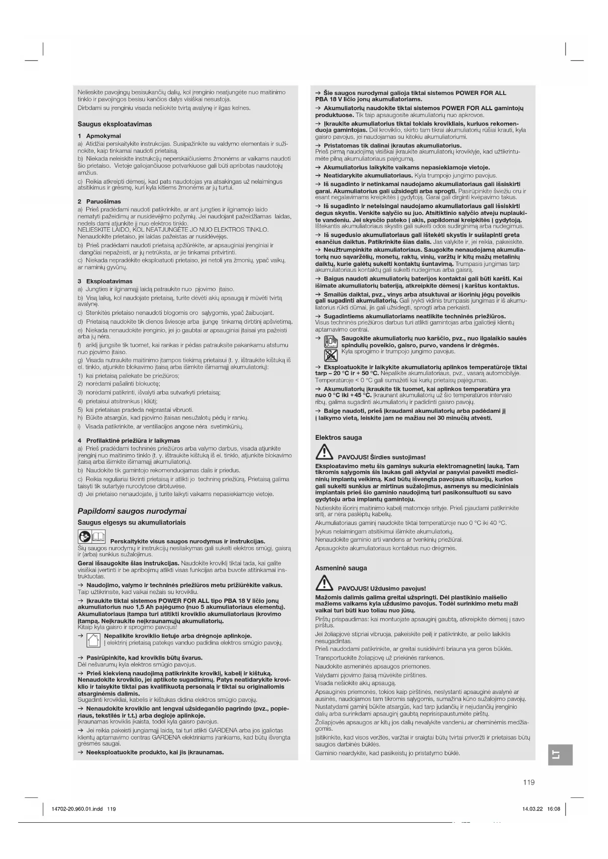Nepalikite kroviklio lietuje arba drėgnoje aplinkoje. Į elektrinį prietaisą patekęs vanduo padidina elektros smūgio pavojų. v Pasirūpinkite, kad kroviklis būtų švarus. Dėl nešvarumų kyla elektros smūgio pavojus. v Prieš kiekvieną naudojimą patikrinkite kroviklį, kabelį ir kištuką. Nenaudokite kroviklio, jei aptikote sugadinimų. Patys neatidarykite krovi- klio ir taisykite tiktai pas kvalifikuotą personalą ir tiktai su originaliomis atsarginėmis dalimis. Sugadinti krovikliai, kabelis ir kištukas didina elektros smūgio pavojų. v Nenaudokite kroviklio ant lengvai užsidegančio pagrindo (pvz., popie- riaus, tekstilės ir t.t.) arba degioje aplinkoje. Įkraunamas kroviklis įkaista, todėl kyla gaisro pavojus. v Jei reikia pakeisti jungiamąjį laidą, tai turi atlikti GARDENA arba jos įgaliotas klientų aptarnavimo centras GARDENA elektriniams įrankiams, kad būtų išvengta grėsmės saugai. v Neeksploatuokite produkto, kai jis įkraunamas. v Šie saugos nurodymai galioja tiktai sistemos POWER FOR ALL PBA 18 V ličio jonų akumuliatoriams. v Akumuliatorių naudokite tiktai sistemos POWER FOR ALL gamintojų produktuose. Tik taip apsaugosite akumuliatorių nuo apkrovos. v Įkraukite akumuliatorius tiktai tokiais krovikliais, kuriuos rekomen- duoja gamintojas. Dėl kroviklio, skirto tam tikrai akumuliatorių rūšiai krauti, kyla gaisro pavojus, jei naudojamas su kitokiu akumuliatoriumi. v Pristatomas tik dalinai įkrautas akumuliatorius. Prieš pirmą naudojimą visiškai įkraukite akumuliatorių kroviklyje, kad užtikrintu- mėte pilną akumuliatoriaus pajėgumą. v Akumuliatorius laikykite vaikams nepasiekiamoje vietoje. v Neatidarykite akumuliatoriaus. Kyla trumpojo jungimo pavojus. v Iš sugadinto ir netinkamai naudojamo akumuliatoriaus gali išsiskirti garai. Akumuliatorius gali užsidegti arba sprogti. Pasirūpinkite šviežiu oru ir esant negalavimams kreipkitės į gydytoją. Garai gali dirginti kvėpavimo takus. v Iš sugadinto ir neteisingai naudojamo akumuliatoriaus gali išsiskirti degus skystis. Venkite sąlyčio su juo. Atsitiktinio sąlyčio atveju nuplauki- te vandeniu. Jei skysčio pateko į akis, papildomai kreipkitės į gydytoją. Ištekantis akumuliatoriaus skystis gali sukelti odos sudirginimą arba nudegimus. v Iš sugedusio akumuliatoriaus gali ištekėti skystis ir sušlapinti greta esančius daiktus. Patikrinkite šias dalis. Jas valykite ir, jei reikia, pakeiskite. v Neužtrumpinkite akumuliatoriaus. Saugokite nenaudojamą akumulia- torių nuo sąvaržėlių, monetų, raktų, vinių, varžtų ir kitų mažų metalinių daiktų, kurie galėtų sukelti kontaktų šuntavimą. Trumpasis jungimas tarp akumuliatoriaus kontaktų gali sukelti nudegimus arba gaisrą. v Baigus naudoti akumuliatorių baterijos kontaktai gali būti karšti. Kai išimate akumuliatorių bateriją, atkreipkite dėmesį į karštus kontaktus. v Smailūs daiktai, pvz., vinys arba atsuktuvai ar išorinių jėgų poveikis gali sugadinti akumuliatorių. Gali įvykti vidinis trumpasis jungimas ir iš akumu- liatorius rūkti dūmai, jis gali užsidegti, sprogti arba perkaisti. v Sugadintiems akumuliatoriams neatlikite techninės priežiūros. Visus techninės priežiūros darbus turi atlikti gamintojas arba įgaliotieji klientų aptarnavimo centrai.