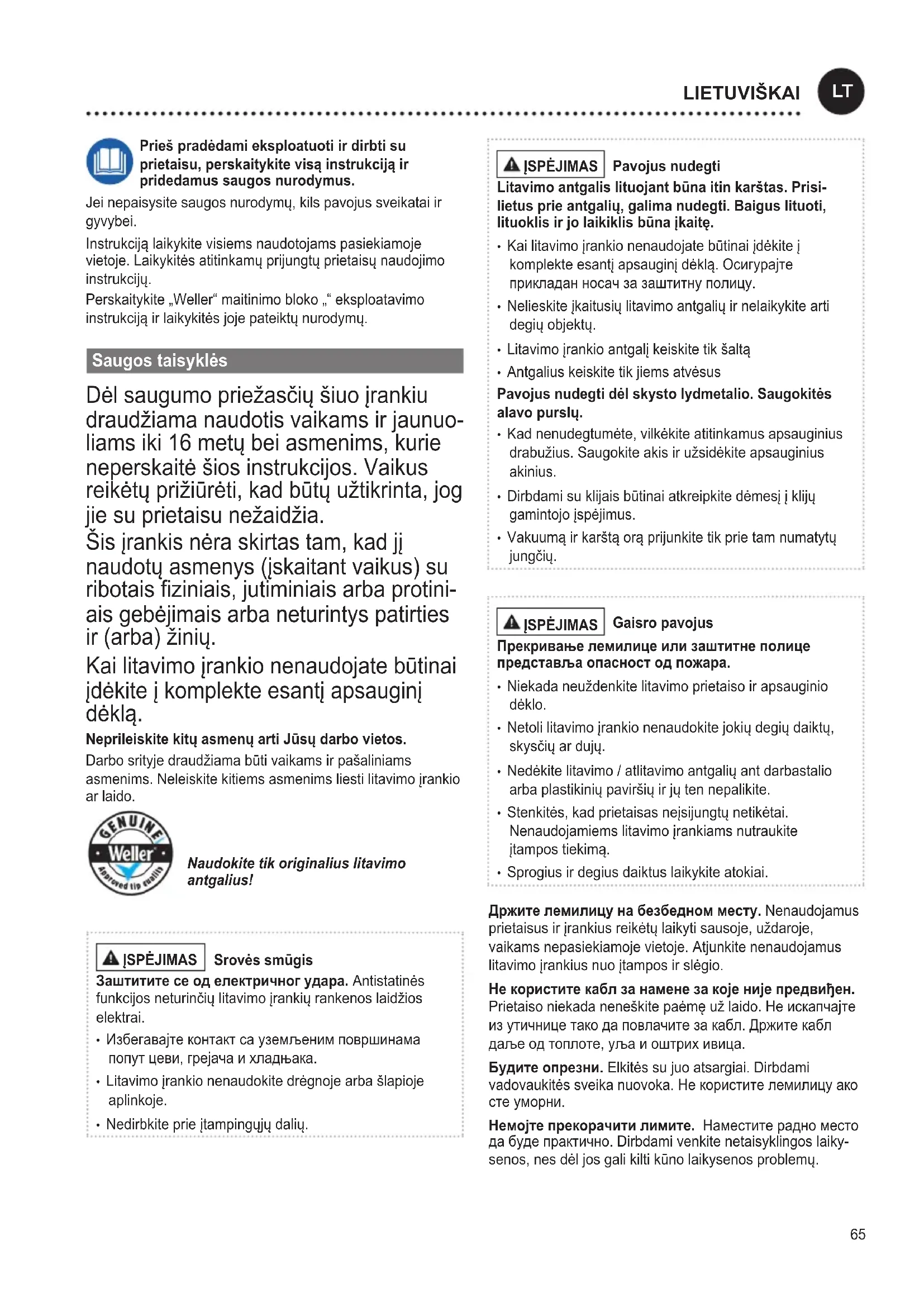 LATVISKI65 Prieš pradėdami eksploatuoti ir dirbti su prietaisu, perskaitykite visą instrukciją ir pridedamus saugos nurodymus. Jei nepaisysite saugos nurodymų, kils pavojus sveikatai ir gyvybei. Instrukcij laikykite visiems naudotojams pasiekiamoje vietoje. Laikykitės atitinkamų prijungtų prietaisų naudojimo instrukcijų. Perskaitykite „Weller“ maitinimo bloko „“ eksploatavimo instrukcij ir laikykitės joje pateiktų nurodymų. Saugos taisyklės Dėl saugumo priežasčių šiuo įrankiu draudžiama naudotis vaikams ir jaunuo- liams iki 16 metų bei asmenims, kurie neperskaitė šios instrukcijos. Vaikus reikėtų prižiūrėti, kad būtų užtikrinta, jog jie su prietaisu nežaidžia. Šis įrankis nėra skirtas tam, kad jį naudotų asmenys (įskaitant vaikus) su ribotais ziniais, jutiminiais arba protini
