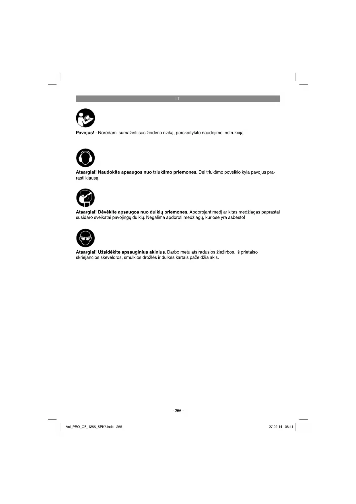 Pavojus! - Norėdami sumažinti susižeidimo riziką, perskaitykite naudojimo instrukciją Atsargiai! Naudokite apsaugos nuo triukšmo priemones. Dėl triukšmo poveikio kyla pavojus pra- rasti klausą. Atsargiai! Užsidėkite apsauginius akinius. Darbo metu atsiradusios žiežirbos, iš prietaiso skriejančios skeveldros, smulkios drožlės ir dulkės kartais pažeidžia akis. Atsargiai! Dėvėkite apsaugos nuo dulkių priemones. Apdorojant medį ar kitas medžiagas paprastai susidaro sveikatai pavojingų dulkių. Negalima apdoroti medžiagų, kuriose yra asbesto! Anl_PRO_OF_1255_SPK7.indb 256Anl_PRO_OF_1255_SPK7.indb 256 27.02.14 08:4127.02.14 08:41LT