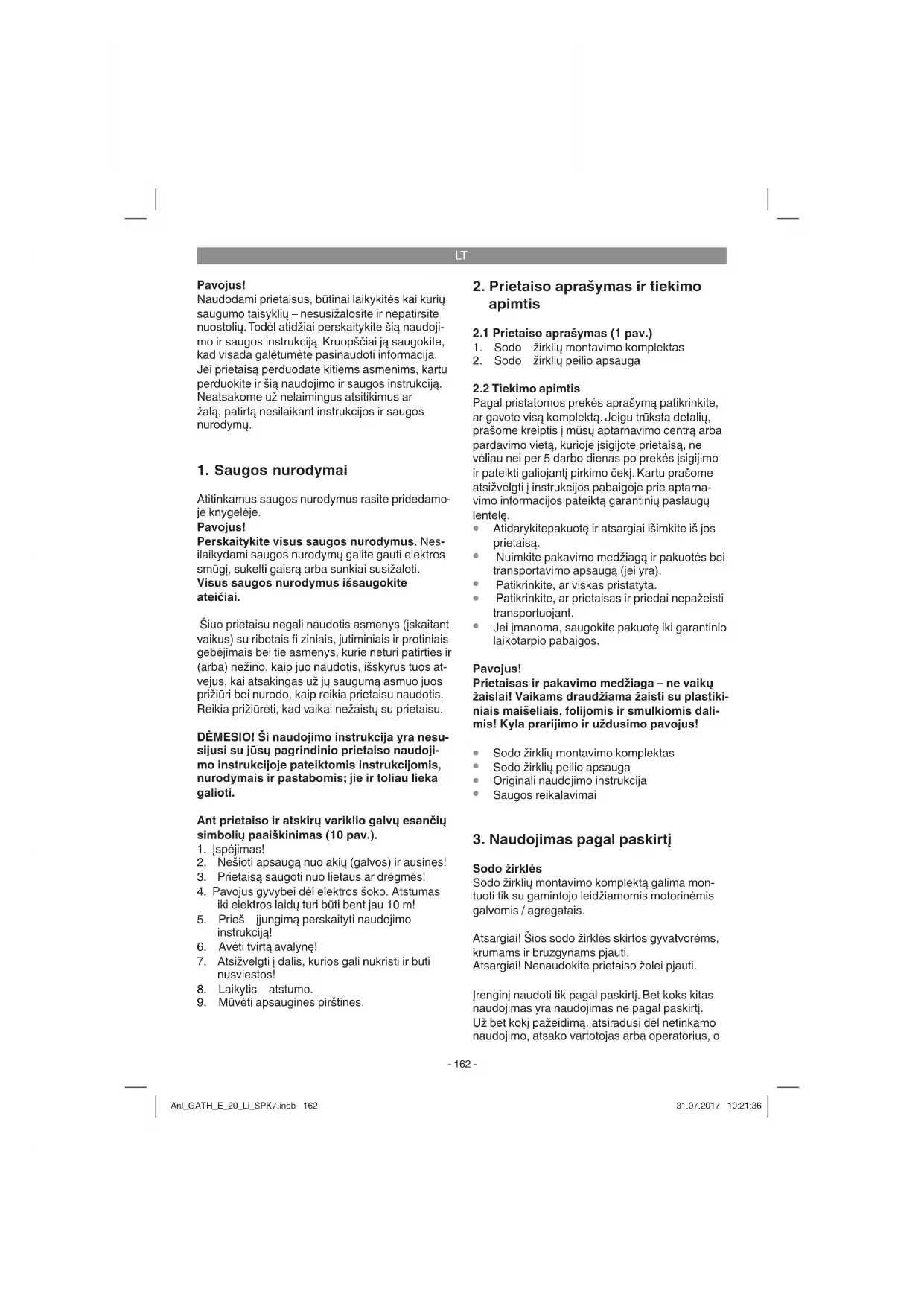 Sodo žirklės Sodo žirklių montavimo komplektą galima mon- tuoti tik su gamintojo leidžiamomis motorinėmis galvomis / agregatais. Atsargiai! Šios sodo žirklės skirtos gyvatvorėms, krūmams ir brūzgynams pjauti. Atsargiai! Nenaudokite prietaiso žolei pjauti. Įrenginį naudoti tik pagal paskirtį. Bet koks kitas naudojimas yra naudojimas ne pagal paskirtį. Už bet kokį pažeidimą, atsiradusi dėl netinkamo naudojimo, atsako vartotojas arba operatorius, o Anl_GATH_E_20_Li_SPK7.indb 162Anl_GATH_E_20_Li_SPK7.indb 162 31.07.2017 10:21:3631.07.2017 10:21:36LT