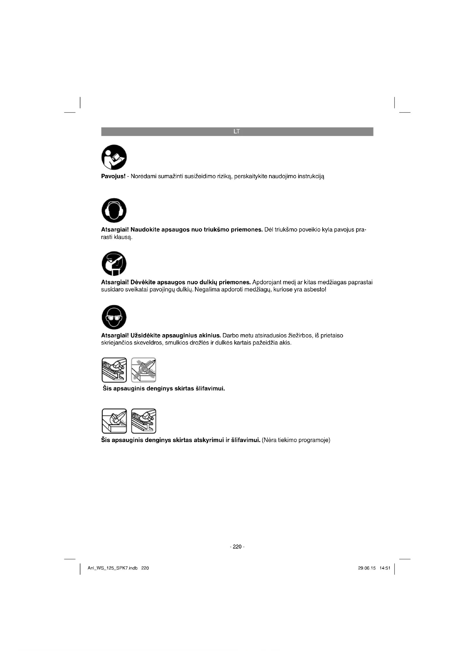 Pavojus! - Norėdami sumažinti susižeidimo riziką, perskaitykite naudojimo instrukciją Atsargiai! Naudokite apsaugos nuo triukšmo priemones. Dėl triukšmo poveikio kyla pavojus pra- rasti klausą. Atsargiai! Užsidėkite apsauginius akinius. Darbo metu atsiradusios žiežirbos, iš prietaiso skriejančios skeveldros, smulkios drožlės ir dulkės kartais pažeidžia akis. Atsargiai! Dėvėkite apsaugos nuo dulkių priemones. Apdorojant medį ar kitas medžiagas paprastai susidaro sveikatai pavojingų dulkių. Negalima apdoroti medžiagų, kuriose yra asbesto! Šis apsauginis denginys skirtas atskyrimui ir šlifavimui. (Nėra tiekimo programoje) Šis apsauginis denginys skirtas šlifavimui. Anl_WS_125_SPK7.indb 220Anl_WS_125_SPK7.indb 220 29.06.15 14:5129.06.15 14:51LT