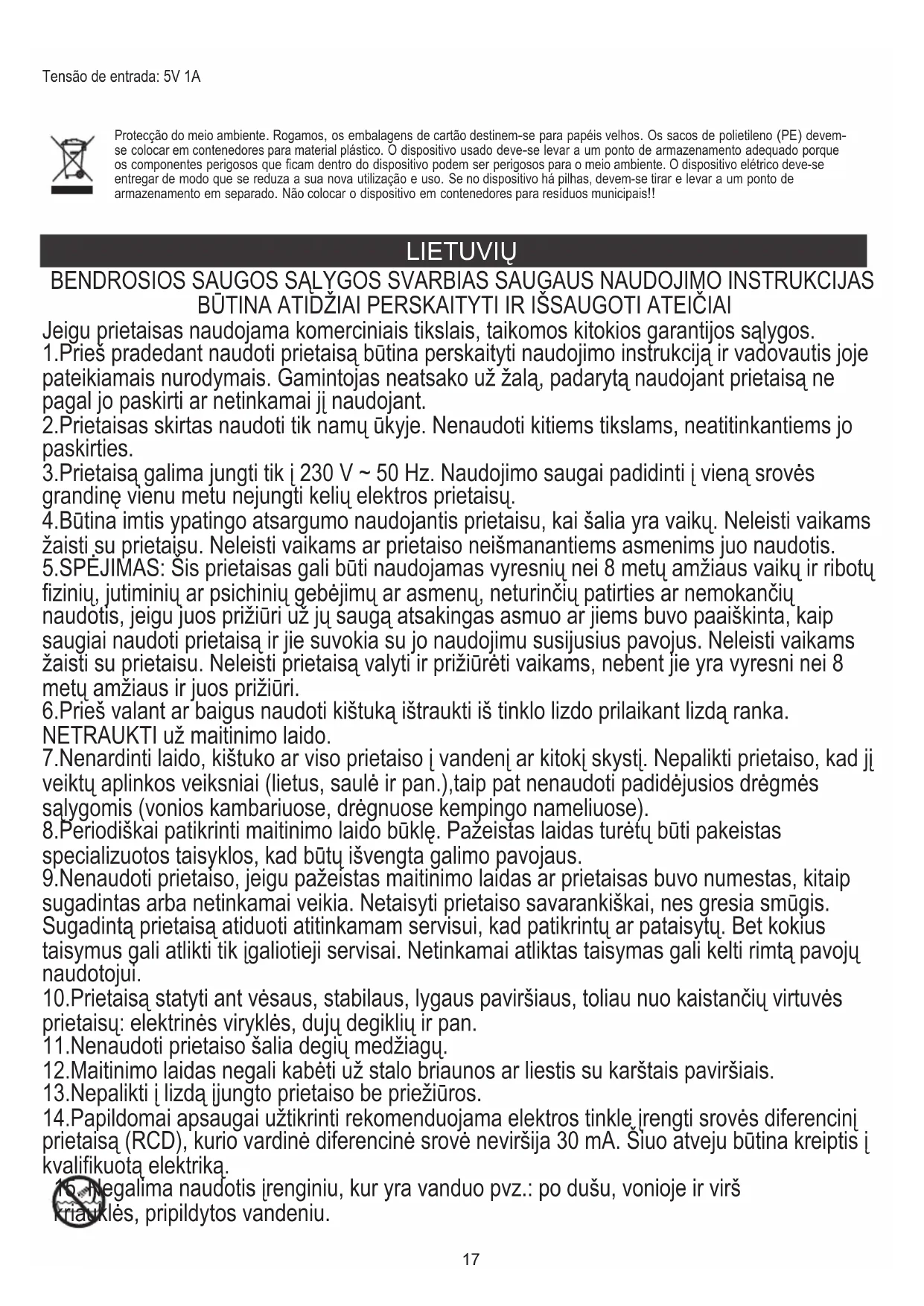 17. Negalima prileisti prie įrenginio ir maitintuvo sušlapimo. Kuomet įrenginys įkris į vandenį,