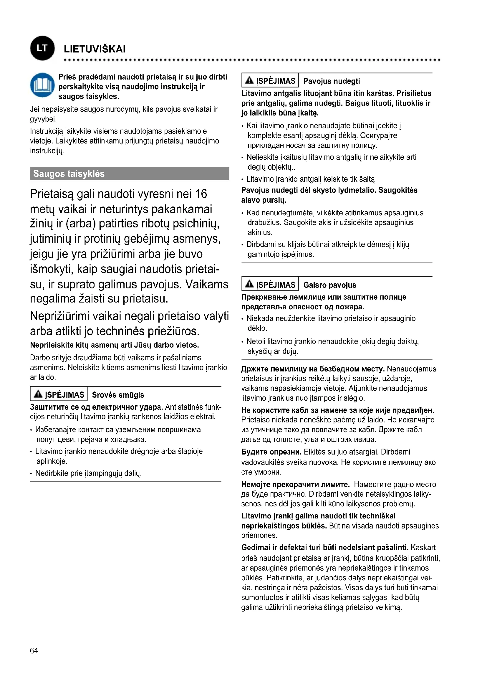 LATVISKI64 Prieš pradėdami naudoti prietaisą ir su juo dirbti perskaitykite visą naudojimo instrukciją ir saugos taisykles. Jei nepaisysite saugos nurodymų, kils pavojus sveikatai ir gyvybei. Instrukciją laikykite visiems naudotojams pasiekiamoje vietoje. Laikykitės atitinkamų prijungtų prietaisų naudojimo instrukcijų. Saugos taisyklės Prietaisą gali naudoti vyresni nei 16 metų vaikai ir neturintys pakankamai žinių ir (arba) patirties ribotų psichinių, jutiminių ir protinių gebėjimų asmenys, jeigu jie yra prižiūrimi arba jie buvo išmokyti, kaip saugiai naudotis prietai- su, ir suprato galimus pavojus. Vaikams negalima žaisti su prietaisu. Neprižiūrimi vaikai negali prietaiso valyti arba atlikti jo techninės priežiūros. Neprileiskite kitų asmenų arti Jūsų darbo vietos. Darbo srityje draudžiama būti vaikams ir pašaliniams asmenims. Neleiskite kitiems asmenims liesti litavimo įrankio ar laido. SPJIMAS Srovės smūgis Заштитите се од електричног удара. Antistatinės funk- cijos neturinčių litavimo įrankių rankenos laidžios elektrai.