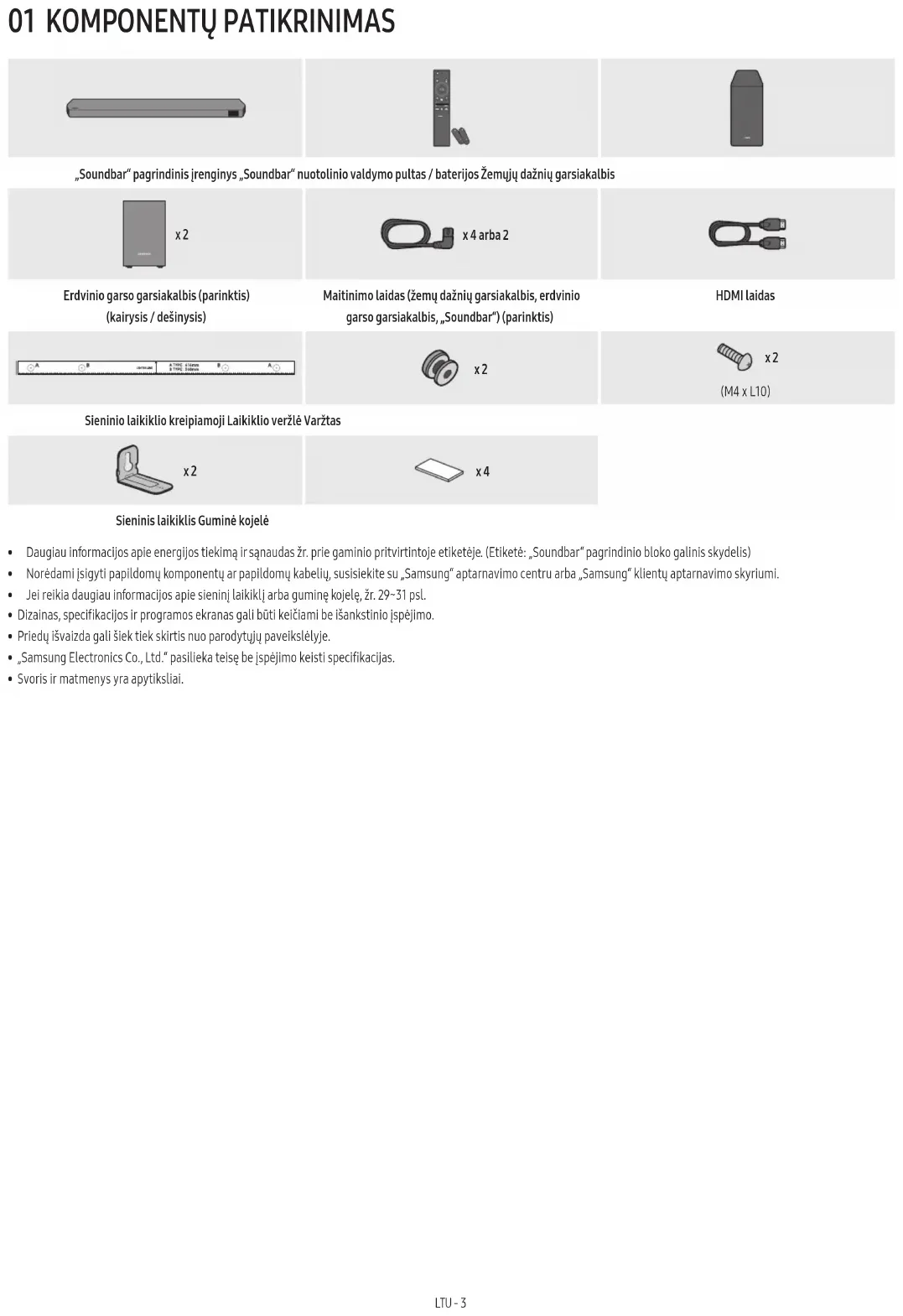 - Soundbar ir saderīga ar AirPlay2, kas instalēts iOS 13.4 vai jaunākā versijā.LTU - 2 TURINYS 01 Komponentų patikrinimas 3 02 Gaminio apžvalga 4 „Soundbar“ viršutinis skydelis . . . . . . . . . . . . . . . . . . . . . . . . . . . . . . . . . . . . . . . . . . . . . . .4 Apatinis „Soundbar“ skydelis . . . . . . . . . . . . . . . . . . . . . . . . . . . . . . . . . . . . . . . . . . . . . . . .5 03 „Soundbar“ garsiakalbio nuotolinio valdymo pulto naudojimas 6 Baterijų įdėjimas prieš pradedant naudotis nuotolinio valdymo pultu (2 AAA tipo baterijos) . . . . . . . . . . . . . . . . . . . . . . . . . . . . . . . . . . . . . . . . . . . . . . . . . . . . . . .6 Kaip naudotis nuotolinio valdymo pultu . . . . . . . . . . . . . . . . . . . . . . . . . . . . . . . . . . . . . .6 „Active Voice Amplier“ (AVA) . . . . . . . . . . . . . . . . . . . . . . . . . . . . . . . . . . . . . . . . . . . . . . .8 Paslėptų mygtukų naudojimas (mygtukai su keliomis funkcijomis) . . . . . . . . . . . . .8 Skirtingų režimų garso efektų išvesties specikacijos . . . . . . . . . . . . . . . . . . . . . . . . .8 „Soundbar“ garsumo reguliavimas televizoriaus nuotoliniu pulteliu. . . . . . . . . . .10 04 „Soundbar“ prijungimas 11 Maitinimo ir įrenginių prijungimas . . . . . . . . . . . . . . . . . . . . . . . . . . . . . . . . . . . . . . . . . . 11 ‒ Rekomenduojamas garsiakalbių išdėstymas . . . . . . . . . . . . . . . . . . . . . . . . . . . . 12 ‒ Erdvinio garso garsiakalbio režimas (tik HW-Q9**C, HW-Q9**GC) . . . . . . . . 12 ‒ Žemų dažnių garsiakalbio arba erdvinio garso garsiakalbių prijungimas rankiniu būdu . . . . . . . . . . . . . . . . . . . . . . . . . . . . . . . . . . . . . . . . . . . . . 13 ‒ Žemų dažnių ir erdvinio garso garsiakalbių gale esančios LED indikatoriaus lemputės . . . . . . . . . . . . . . . . . . . . . . . . . . . . . . . . . . . . . . . . . . . . 14 05 Prisijungimas prie televizoriaus 15 Televizoriaus, palaikančio HDMI ARC (garso grąžinimo kanalas), prijungimas . . . . . . . . . . . . . . . . . . . . . . . . . . . . . . . . . . . . . . . . . . . . . . . . . . . . . . . . . . . . . . .15 Prijungimas naudojant optinį kabelį. . . . . . . . . . . . . . . . . . . . . . . . . . . . . . . . . . . . . . . . .16 Prijungimas per „Bluetooth“ . . . . . . . . . . . . . . . . . . . . . . . . . . . . . . . . . . . . . . . . . . . . . . . .17 Prijungimas naudojant „Wi-Fi“ . . . . . . . . . . . . . . . . . . . . . . . . . . . . . . . . . . . . . . . . . . . . . .19 „Q-Symphony“ funkcijos naudojimas . . . . . . . . . . . . . . . . . . . . . . . . . . . . . . . . . . . . . . . 20 „SpaceFit Sound“ naudojimas. . . . . . . . . . . . . . . . . . . . . . . . . . . . . . . . . . . . . . . . . . . . . . .21 06 Išorinio įrenginio prijungimas 22 1 būdas. Prijungimas naudojant HDMI laidą (gebantį atkurti ir dekoduoti „Dolby Atmos“ / DTS:X). . . . . . . . . . . . . . . . . . . . . . . . . .22 2 būdas. Prijungimas naudojant optinį kabelį . . . . . . . . . . . . . . . . . . . . . . . . . . . . . . . .23 07 Mobiliojo įrenginio prijungimas 24 1 būdas. Prijungimas per „Bluetooth“. . . . . . . . . . . . . . . . . . . . . . . . . . . . . . . . . . . . . . . .24 2 būdas. Prijungimas naudojant „Wi-Fi“ (belaidis tinklas) . . . . . . . . . . . . . . . . . . . . .26 „Tap Sound“ funkcijos naudojimas. . . . . . . . . . . . . . . . . . . . . . . . . . . . . . . . . . . . . . . . . . .27 08 Prisijungimas per „Apple Airplay 2“ 28 09 Sieninio laikiklio montavimas 29 Su įrengimu susijusios atsargumo priemonės. . . . . . . . . . . . . . . . . . . . . . . . . . . . . . . .29 Tvirtinimo prie sienos komponentai. . . . . . . . . . . . . . . . . . . . . . . . . . . . . . . . . . . . . . . . .29 Erdvinio garso garsiakalbių tvirtinimas prie sienos (tik taikomiems modeliams). . . . . . . . . . . . . . . . . . . . . . . . . . . . . . . . . . . . . . . . . . . . . . . 30 10 „Soundbar“ įrengimas priešais televizorių 30 Komponentai. . . . . . . . . . . . . . . . . . . . . . . . . . . . . . . . . . . . . . . . . . . . . . . . . . . . . . . . . . . . . 30 11 Programinės įrangos naujinimas 31 Automatinis naujinimas. . . . . . . . . . . . . . . . . . . . . . . . . . . . . . . . . . . . . . . . . . . . . . . . . . . .31 Naujinimas naudojant USB . . . . . . . . . . . . . . . . . . . . . . . . . . . . . . . . . . . . . . . . . . . . . . . . .31 Inicijavimas . . . . . . . . . . . . . . . . . . . . . . . . . . . . . . . . . . . . . . . . . . . . . . . . . . . . . . . . . . . . . . .32 12 Trikčių šalinimas 32LTU - 3 01 KOMPONENTŲ PATIKRINIMAS SOUNDBAR „Soundbar“ pagrindinis įrenginys „Soundbar“ nuotolinio valdymo pultas / baterijos Žemųjų dažnių garsiakalbis POWER x 2 x 4 arba 2 Erdvinio garso garsiakalbis (parinktis) (kairysis / dešinysis) Maitinimo laidas (žemų dažnių garsiakalbis, erdvinio garso garsiakalbis, „Soundbar“) (parinktis) HDMI laidas x 2 x 2 (M4 x L10) Sieninio laikiklio kreipiamoji Laikiklio veržlė Varžtas x 2 x 4 Sieninis laikiklis Guminė kojelė