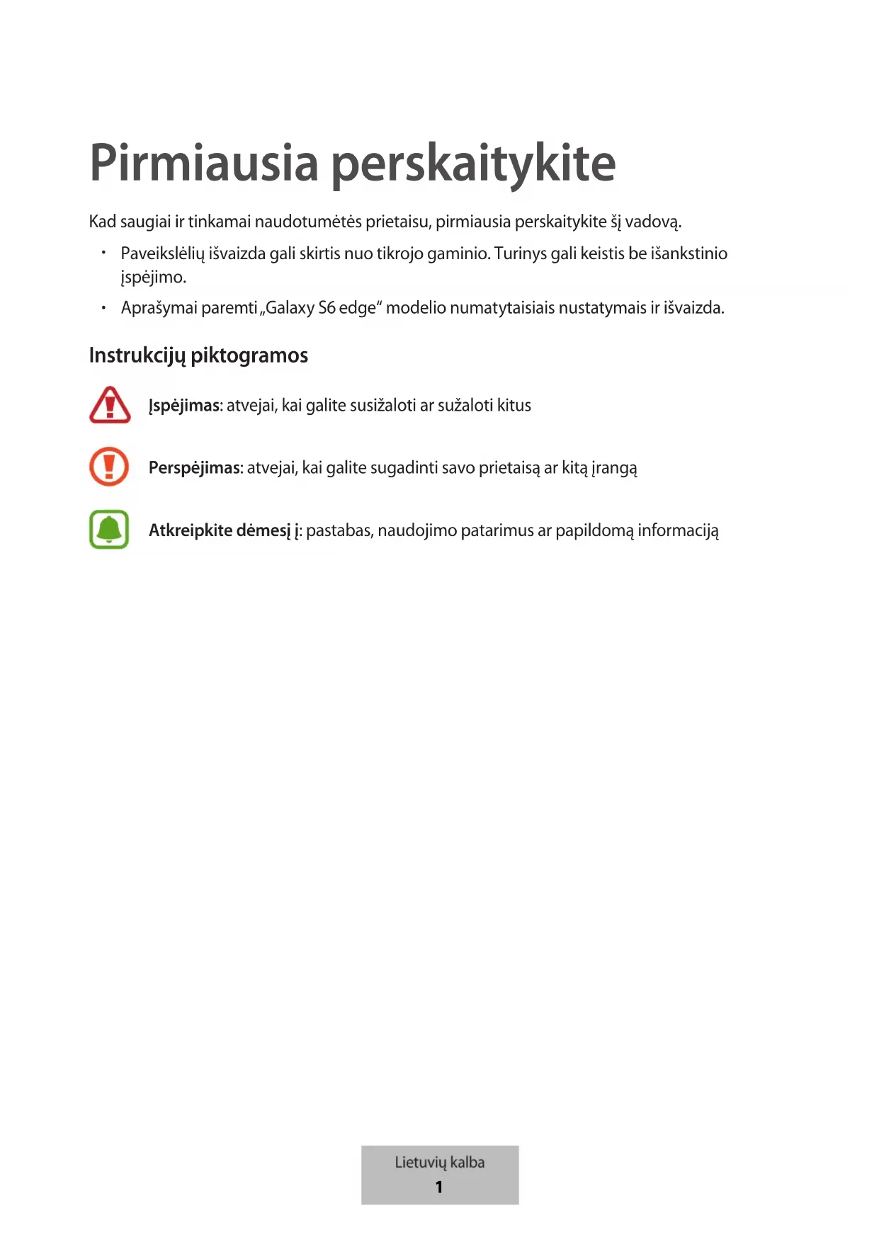 Aprašymai paremti „Galaxy S6 edge“ modelio numatytaisiais nustatymais ir išvaizda. Instrukcijų piktogramos Įspėjimas: atvejai, kai galite susižaloti ar sužaloti kitus Perspėjimas: atvejai, kai galite sugadinti savo prietaisą ar kitą įrangą Atkreipkite dėmesį į: pastabas, naudojimo patarimus ar papildomą informaciją Lietuvių kalba