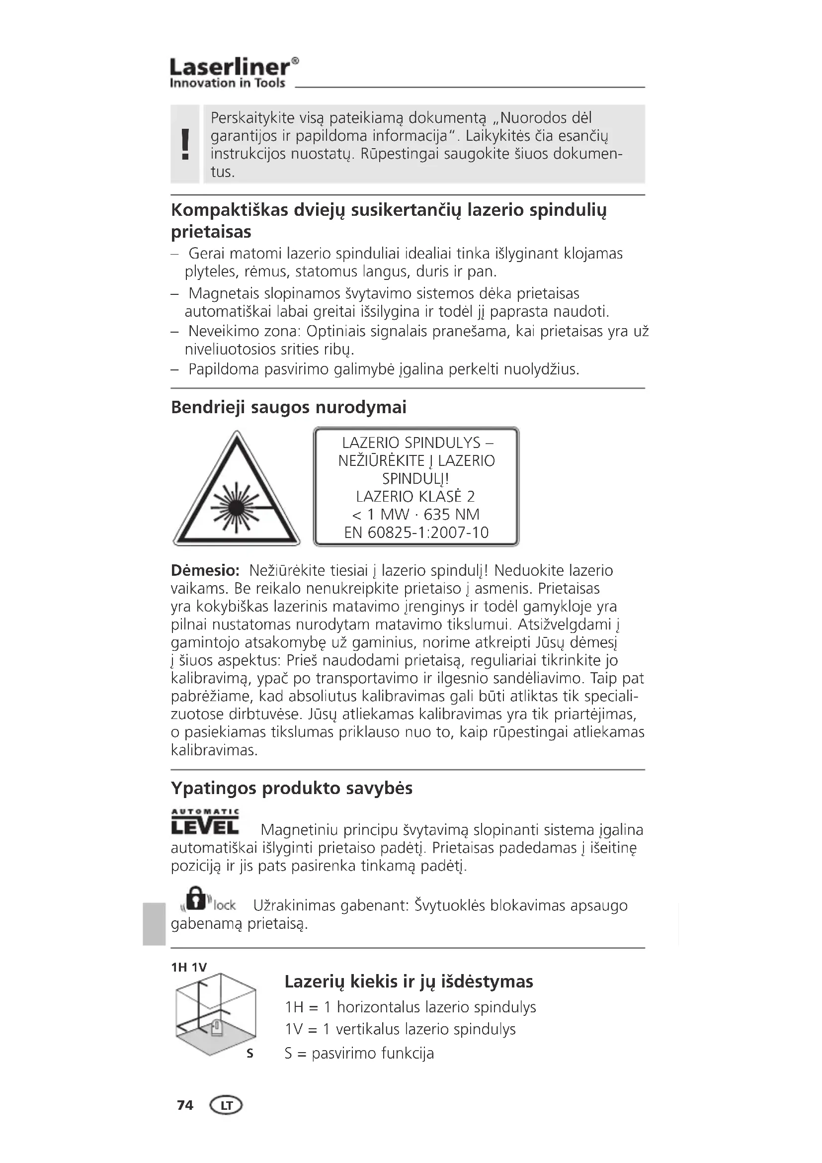 HorizontÞlÞs lĈnijas pÞrbaude: UzstŃdiet ierŘci apm. 5 m no sienas un ieslōdziet krustenisko lŃzerstaru. AtzŘmōjiet uz sienas punktu B. Pagrieziet krustenisko lŃzerstaru par apm. 2,5 m pa labi un atzŘmōjiet punktu C. PŃrbaudiet, vai horizontŃlŃ lŘnija no punkta C atrodas ± 2 mm tŃdŃ pašŃ augstumŃ kŃ B punkts. AtkŃrtojiet procedŴru, pagriežot pa kreisi. LV74 Kompaktiškas dviejŇ susikertanêiŇ lazerio spinduliŇ prietaisas – Gerai matomi lazerio spinduliai idealiai tinka išlyginant klojamas plyteles, rŏmus, statomus langus, duris ir pan. – Magnetais slopinamos švytavimo sistemos dŏka prietaisas automatiškai labai greitai išsilygina ir todŏl jř paprasta naudoti. – Neveikimo zona: Optiniais signalais pranešama, kai prietaisas yra už niveliuotosios srities ribŸ. – Papildoma pasvirimo galimybŏ řgalina perkelti nuolydžius. Ypatingos produkto savybôs Magnetiniu principu švytavimŅ slopinanti sistema řgalina automatiškai išlyginti prietaiso padŏtř. Prietaisas padedamas ř išeitinŐ pozicijŅ ir jis pats pasirenka tinkamŅ padŏtř. Užrakinimas gabenant: Švytuoklŏs blokavimas apsaugo gabenamŅ prietaisŅ. Dômesio: NežiŴrŏkite tiesiai ř lazerio spindulř! Neduokite lazerio vaikams. Be reikalo nenukreipkite prietaiso ř asmenis. Prietaisas yra kokybiškas lazerinis matavimo řrenginys ir todŏl gamykloje yra pilnai nustatomas nurodytam matavimo tikslumui. Atsižvelgdami ř gamintojo atsakomybŐ už gaminius, norime atkreipti JŴsŸ dŏmesř ř šiuos aspektus: Prieš naudodami prietaisŅ, reguliariai tikrinkite jo kalibravimŅ, ypaň po transportavimo ir ilgesnio sandŏliavimo. Taip pat pabrŏžiame, kad absoliutus kalibravimas gali bŴti atliktas tik speciali- zuotose dirbtuvŏse. JŴsŸ atliekamas kalibravimas yra tik priartŏjimas, o pasiekiamas tikslumas priklauso nuo to, kaip rŴpestingai atliekamas kalibravimas. Bendrieji saugos nurodymai LAZERIO SPINDULYS – NEŽIĺRĖKITE ġ LAZERIO SPINDULġ! LAZERIO KLASĖ 2 < 1 MW · 635 NM EN 60825-1:2007-10 LazeriŇ kiekis ir jŇ išdôstymas 1H = 1 horizontalus lazerio spindulys 1V = 1 vertikalus lazerio spindulys S = pasvirimo funkcija