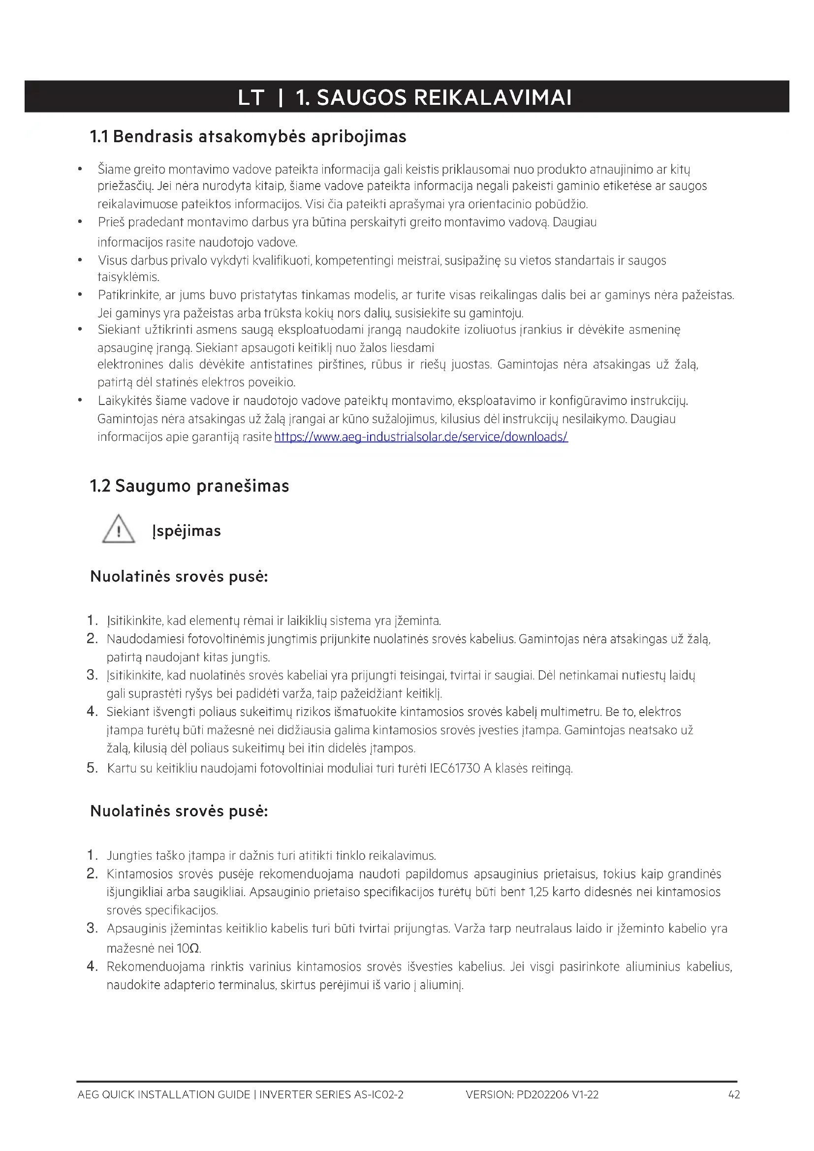 - Laikykitės šiame vadove ir naudotojo vadove pateiktų montavimo, eksploatavimo ir konfigūravimo instrukcijų. Gamintojas nėra atsakingas už žalą įrangai ar kūno sužalojimus, kilusius dėl instrukcijų nesilaikymo. Daugiau informacijos apie garantiją rasite https://www.aeg-industrialsolar.de/service/downloads/