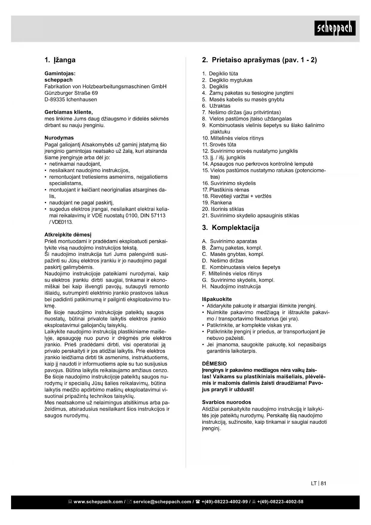 Gamintojas: scheppach Fabrikation von Holzbearbeitungsmaschinen GmbH Günzburger Straße 69 D-89335 Ichenhausen Gerbiamas kliente, mes linkime Jums daug džiaugsmo ir didelės sėkmės dirbant su nauju įrenginiu. Nurodymas Pagal galiojantį Atsakomybės už gaminį įstatymą šio įrenginio gamintojas neatsako už žalą, kuri atsiranda šiame įrenginyje arba dėl jo: