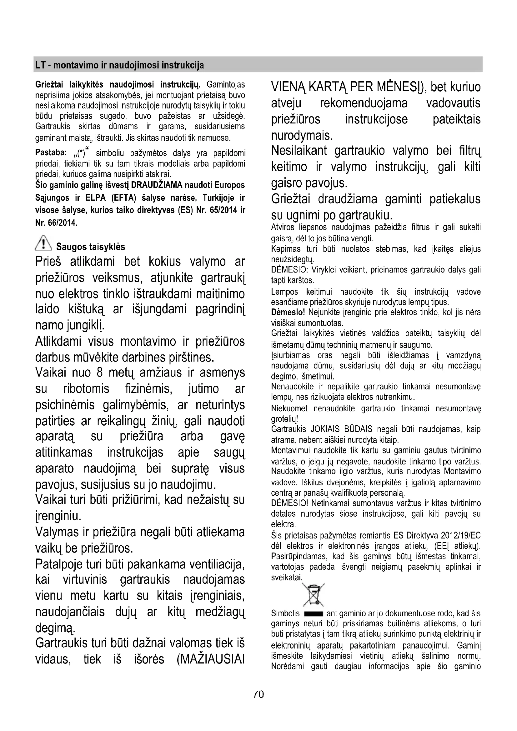 Вставити вугільний фільтр в середину відповідної порожнини та закріпити його, повертаючи на 90°ручки О, закрити кришку. Виконати дії в протилежному порядку для демонтажу. Округлий (V1-V2-V3-різні моделі): Байонетний паз - встановити його по центру, покриваючи захисну для двигуна сітку та звертаючи увагу, щоб точки X1 чи X2 чи X3 на вугільному фільтрові відповідали точкам Y1 чи Y2 на конвеєрі, потім повернути його за годинниковою стрілкою; для демонтажу повернути у протилежну сторону, якщо є язичок Z не забудьте спочатку трохи підняти його. Заміна Ламп Відключити прилад від електромережі. Увага! Перш ніж торкати лампи необхідно впевнитися що вони охололи. Замінити пошкоджену лампочку на нову такого ж типу, як зазначено на етикетці, або поруч з лампочкою на витяжці. Заміна лампочо28W - Викрутити пошкоджену лампочку та замінити її на овальну лампочку галогенної максимум 28W E14. Зняти сітку, щоб доступитися до місця де знаходяться лампочки. Заміна галогенної лампочки - Відкрити нішу де знаходяться лампочки – вийняти захисну планку за допомогою невеликої викрутки або подібного інструменту. Замініть перегорілу лампу. Використовуйте для цього лише галогенні лампи на 20W макс (G4), не доторкуючись до них руками. Закрийте плафон (кріплення засувкою). Якщо система підсвітки не працює, перевірте вірну установку ламп в гнізда, перед тим як звертатися до центру технічної допомоги.70 LT - montavimo ir naudojimosi instrukcija Griežtai laikykitės naudojimosi instrukcijų. Gamintojas neprisiima jokios atsakomybės, jei montuojant prietaisą buvo nesilaikoma naudojimosi instrukcijoje nurodytų taisyklių ir tokiu būdu prietaisas sugedo, buvo pažeistas ar užsidegė. Gartraukis skirtas dūmams ir garams, susidariusiems gaminant maistą, ištraukti. Jis skirtas naudoti tik namuose. Pastaba: „(*)“ simboliu pažymėtos dalys yra papildomi priedai, tiekiami tik su tam tikrais modeliais arba papildomi priedai, kuriuos galima nusipirkti atskirai. Šio gaminio galinę išvestį DRAUDŽIAMA naudoti Europos Sąjungos ir ELPA (EFTA) šalyse narėse, Turkijoje ir visose šalyse, kurios taiko direktyvas (ES) Nr. 65/2014 ir Nr. 66/2014. Saugos taisyklės Prieš atlikdami bet kokius valymo ar priežiūros veiksmus, atjunkite gartraukį nuo elektros tinklo ištraukdami maitinimo laido kištuką ar išjungdami pagrindinį namo jungiklį. Atlikdami visus montavimo ir priežiūros darbus mūvėkite darbines pirštines. Vaikai nuo 8 metų amžiaus ir asmenys su ribotomis fizinėmis, jutimo ar psichinėmis galimybėmis, ar neturintys patirties ar reikalingų žinių, gali naudoti aparatą su priežiūra arba gavę atitinkamas instrukcijas apie saugų aparato naudojimą bei supratę visus pavojus, susijusius su jo naudojimu. Vaikai turi būti prižiūrimi, kad nežaistų su įrenginiu. Valymas ir priežiūra negali būti atliekama vaikų be priežiūros. Patalpoje turi būti pakankama ventiliacija, kai virtuvinis gartraukis naudojamas vienu metu kartu su kitais įrenginiais, naudojančiais dujų ar kitų medžiagų degimą. Gartraukis turi būti dažnai valomas tiek iš vidaus, tiek iš išorės (MAŽIAUSIAI VIENĄ KARTĄ PER MĖNESĮ), bet kuriuo atveju rekomenduojama vadovautis priežiūros instrukcijose pateiktais nurodymais. Nesilaikant gartraukio valymo bei filtrų keitimo ir valymo instrukcijų, gali kilti gaisro pavojus. Griežtai draudžiama gaminti patiekalus su ugnimi po gartraukiu. Atviros liepsnos naudojimas pažeidžia filtrus ir gali sukelti gaisrą, dėl to jos būtina vengti. Kepimas turi būti nuolatos stebimas, kad įkaitęs aliejus neužsidegtų. DĖMESIO: Viryklei veikiant, prieinamos gartraukio dalys gali tapti karštos. Lempos keitimui naudokite tik šių instrukcijų vadove esančiame priežiūros skyriuje nurodytus lempų tipus. Dėmesio! Nejunkite įrenginio prie elektros tinklo, kol jis nėra visiškai sumontuotas. Griežtai laikykitės vietinės valdžios pateiktų taisyklių dėl išmetamų dūmų techninių matmenų ir saugumo. Įsiurbiamas oras negali būti išleidžiamas į vamzdyną naudojamą dūmų, susidariusių dėl dujų ar kitų medžiagų degimo, išmetimui. Nenaudokite ir nepalikite gartraukio tinkamai nesumontavę lempų, nes rizikuojate elektros nutrenkimu. Niekuomet nenaudokite gartraukio tinkamai nesumontavę grotelių! Gartraukis JOKIAIS BŪDAIS negali būti naudojamas, kaip atrama, nebent aiškiai nurodyta kitaip. Montavimui naudokite tik kartu su gaminiu gautus tvirtinimo varžtus, o jeigu jų negavote, naudokite tinkamo tipo varžtus. Naudokite tinkamo ilgio varžtus, kuris nurodytas Montavimo vadove. Iškilus dvejonėms, kreipkitės į įgaliotą aptarnavimo centrą ar panašų kvalifikuotą personalą. DĖMESIO! Netinkamai sumontavus varžtus ir kitas tvirtinimo detales nurodytas šiose instrukcijose, gali kilti pavojų su elektra. Šis prietaisas pažymėtas remiantis E
