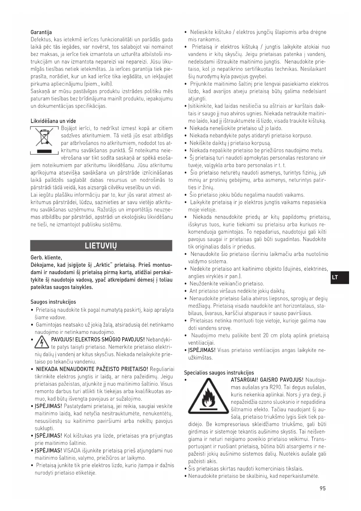 ATSARGIAI! GAISRO PAVOJUS! Naudoja- mas aušalas yra R290. Tai degus aušalas, kuris nekenkia aplinkai. Nors ji yra degi, ji nepažeidžia ozono sluoksnio ir nepadidina šiltnamio efekto. Tačiau naudojant šį au