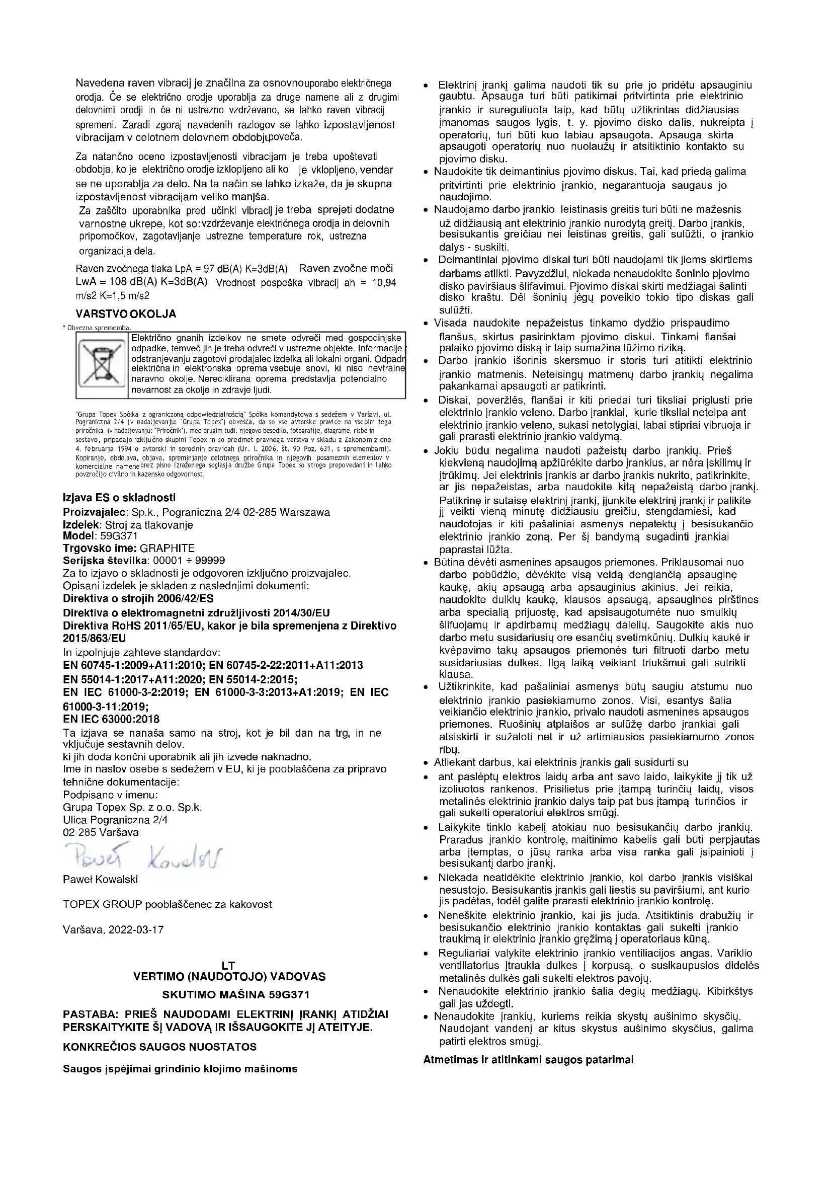 EB atitikties deklaracija Gamintojas: Sp.k., Pograniczna 2/4 02-285 Warszawa Produktas: Trinkelių klojimo mašina Modelis: 59G371 Prekybos pavadinimas: GRAPHITE Serijos numeris: 00001 ÷ 99999 Už šią atitikties deklaraciją atsako tik gamintojas. Pirmiau aprašytas gaminys atitinka šiuos dokumentus: Mašinų direktyva 2006/42/EB Elektromagnetinio suderinamumo direktyva 2014/30/ES RoHS direktyva 2011/65/ES su pakeitimais, padarytais Direktyva 2015/863/ES Ir atitinka standartų reikalavimus: EN 60745-1:2009+A11:2010; EN 60745-2-22:2011+A11:2013 EN 55014-1:2017+A11:2020; EN 55014-2:2015; EN IEC 61000-3-2:2019; EN 61000-3-3:2013+A1:2019; EN IEC 61000-3-11:2019; EN IEC 63000:2018 Ši deklaracija taikoma tik tokioms mašinoms, kokios jos pateikiamos į rinką, ir neapima sudedamųjų dalių. prideda galutinis naudotojas arba atlieka vėliau. ES reziduojančio asmens, įgalioto rengti techninę dokumentaciją, vardas, pavardė ir adresas: Pasirašyta: Grupa Topex Sp. z o.o. Sp.k. Pograniczna gatvė 2/4 02-285 Varšuva Paweł Kowalski TOPEX GROUP kokybės pareigūnas Varšuva, 2022-03-17