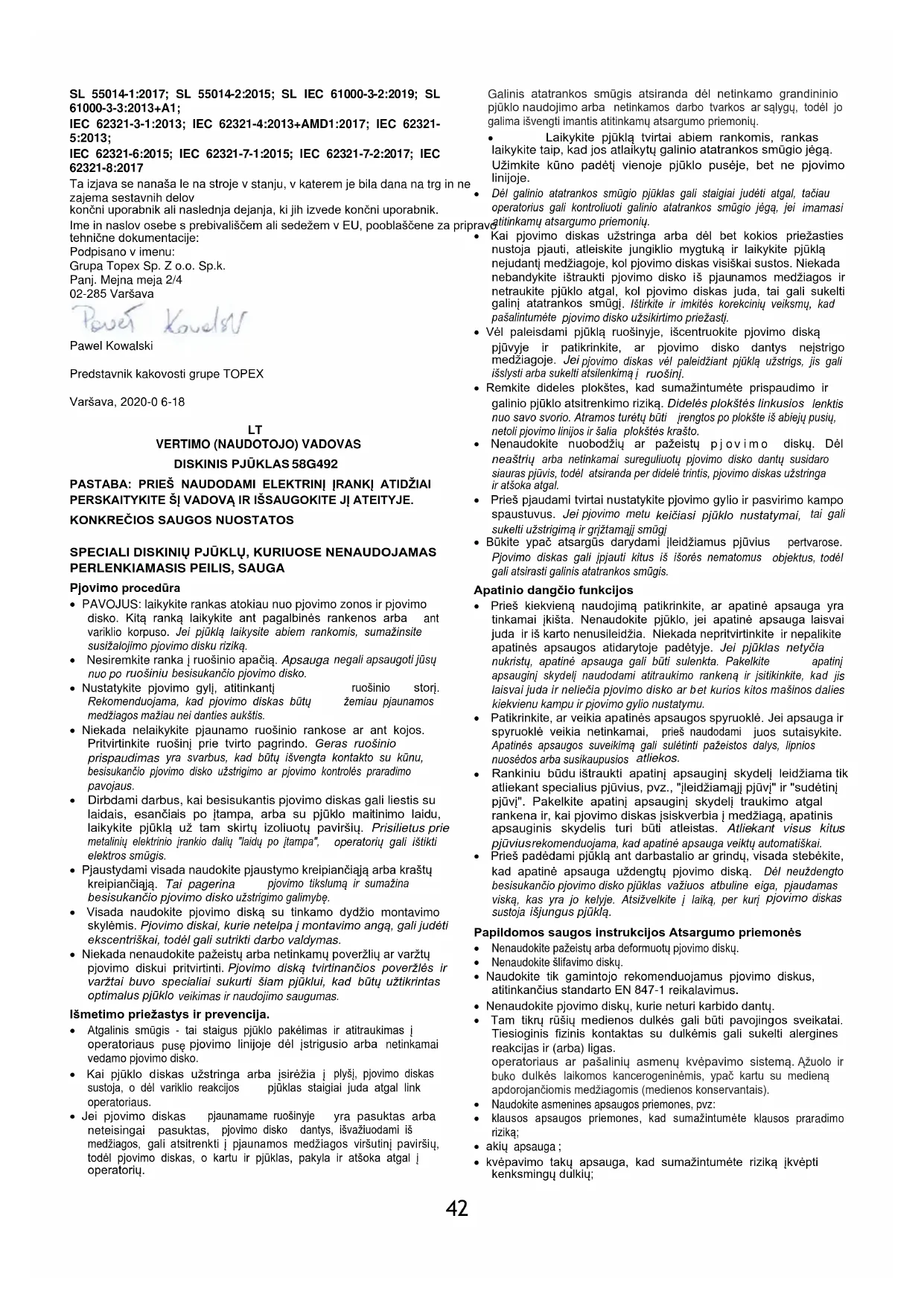 Elektra varomų gaminių negalima išmesti kartu su buitinėmis atliekomis, juos reikia pristatyti į atitinkamas utilizavimo vietas. Dėl informacijos apie šalinimą kreipkitės į gaminio pardavėją arba vietos valdžios instituciją. Elektros ir elektroninės įrangos atliekose yra medžiagų, kurios nėra nekenksmingos aplinkai. Neperdirbta įranga kelia galimą pavojų aplinkai ir žmonių sveikatai. "Grupa Topex Spółka z ograniczoną odpowiedzialnością" "Spółka komandytowa", kurios registruota buveinė yra Varšuvoje, ul. Pograniczna 2/4 (toliau - "Grupa Topex") informuoja, kad visos autorių teisės į šio vadovo (toliau - "Vadovas") turinį, įskaitant, be kita ko. jo tekstą, nuotraukas, diagramas, brėžinius, taip pat jo kompoziciją, priklauso tik "Grupa Topex" ir yra teisinės apsaugos objektas pagal 1994 m. vasario 4 d. Autorių teisių ir gretutinių teisių įstatymą (t. y. 2006 m. Įstatymų leidinys Nr. 90 Poz. 631 su pakeitimais). Kopijuoti, apdoroti, skelbti, keisti visą vadovą ir atskirus jo elementus komerciniais tikslais be raštiško "Grupa Topex" sutikimo yra griežtai draudžiama ir gali užtraukti civilinę ir baudžiamąją atsakomybę. EB atitikties deklaracija Gamintojas: Grupa Topex Sp. Z o.o. Sp.k., Pograniczna 2/4 02-285 Varšuva Gaminys: Diskinis pjūklas Produkto Nr.: 58G492 Prekės pavadinimas: GRAPHITE Serijos numeris: 00001 ÷ 99999 Ši atitikties deklaracija išduodama tik gamintojo atsakomybe. Pirmiau aprašytas produktas atitinka šiuos dokumentus: Mašinų direktyva 2006/42/EB Elektromagnetinio suderinamumo direktyva 2014/30/ES Pavojingų medžiagų naudojimo apribojimo direktyvos 2011/65/ES su pakeitimais, padarytais Direktyva 2015/863/ES Ir atitinka šių standartų reikalavimus: EN 62841-1:2015; EN 62841-2-5:2014; EN 55014-1:2017; EN 55014-2:2015; EN IEC 61000-3-2:2019; EN 61000-3-3:2013+A1; IEC 62321-3-1:2013; IEC 62321-4:2013+AMD1:2017; IEC 62321- 5:2013; IEC 62321-6:2015; IEC 62321-7-1:2015; IEC 62321-7-2:2017; IEC 62321-8:2017 Šioje deklaracijoje nurodomos tik tokios būklės mašinos, kokios jos buvo pateiktos rinkai, ir neklasifikuojamos sudedamosios dalys. prideda galutinis naudotojas arba vėlesnius galutinio naudotojo atliktus veiksmus.46 ES gyvenančio arba įsisteigusio asmens, įgalioto parengti techninius dokumentus, vardas, pavardė ir adresas: Pasirašyta: Grupa Topex Sp. Z o.o. Sp.k. Avilys. Pasienio kraštas 2/4 02-285 Varšuva Pawelas Kowalskis GRUPA TOPEX kokybės atstovas Varšuva, 2020-0 6-18