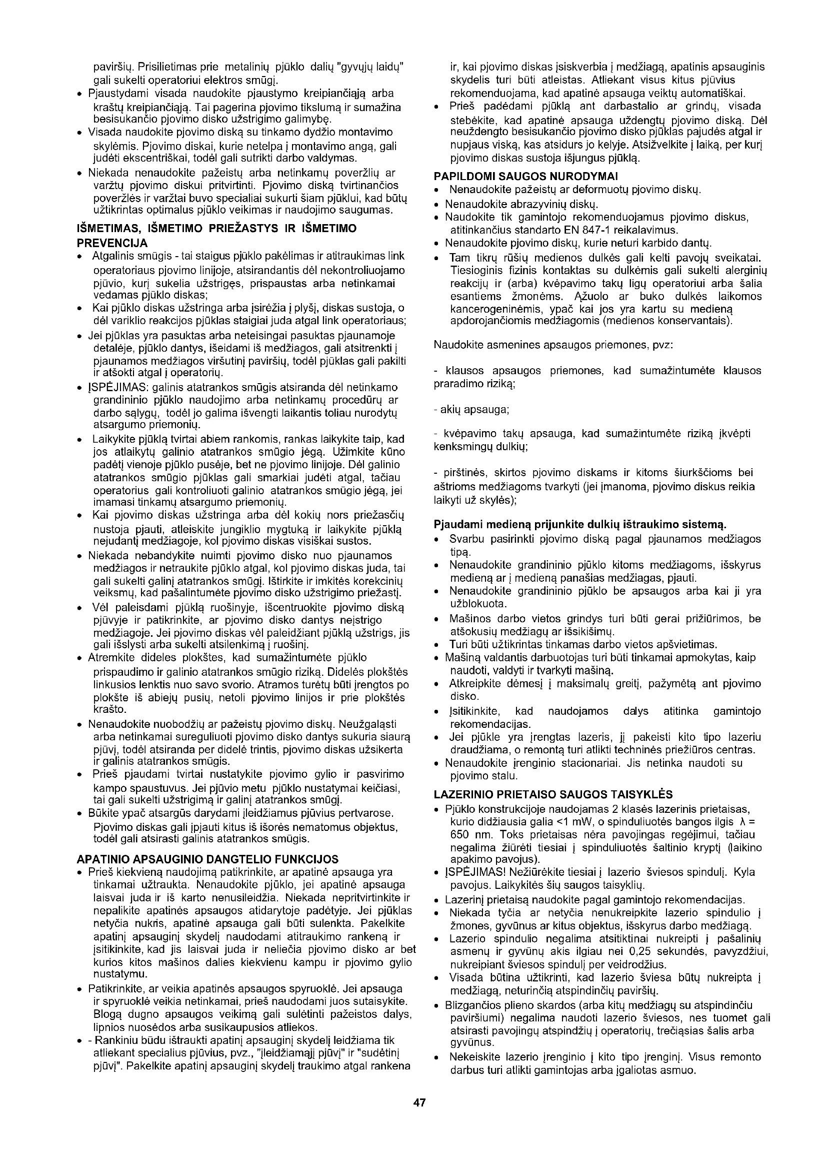 - Dirbdami, kai besisukantis pjovimo diskas gali liestis su laidais, esančiais po įtampa, laikykite pjūklą už tam skirtų izoliuotų47 paviršių. Prisilietimas prie metalinių pjūklo dalių "gyvųjų laidų" gali sukelti operatoriui elektros smūgį.