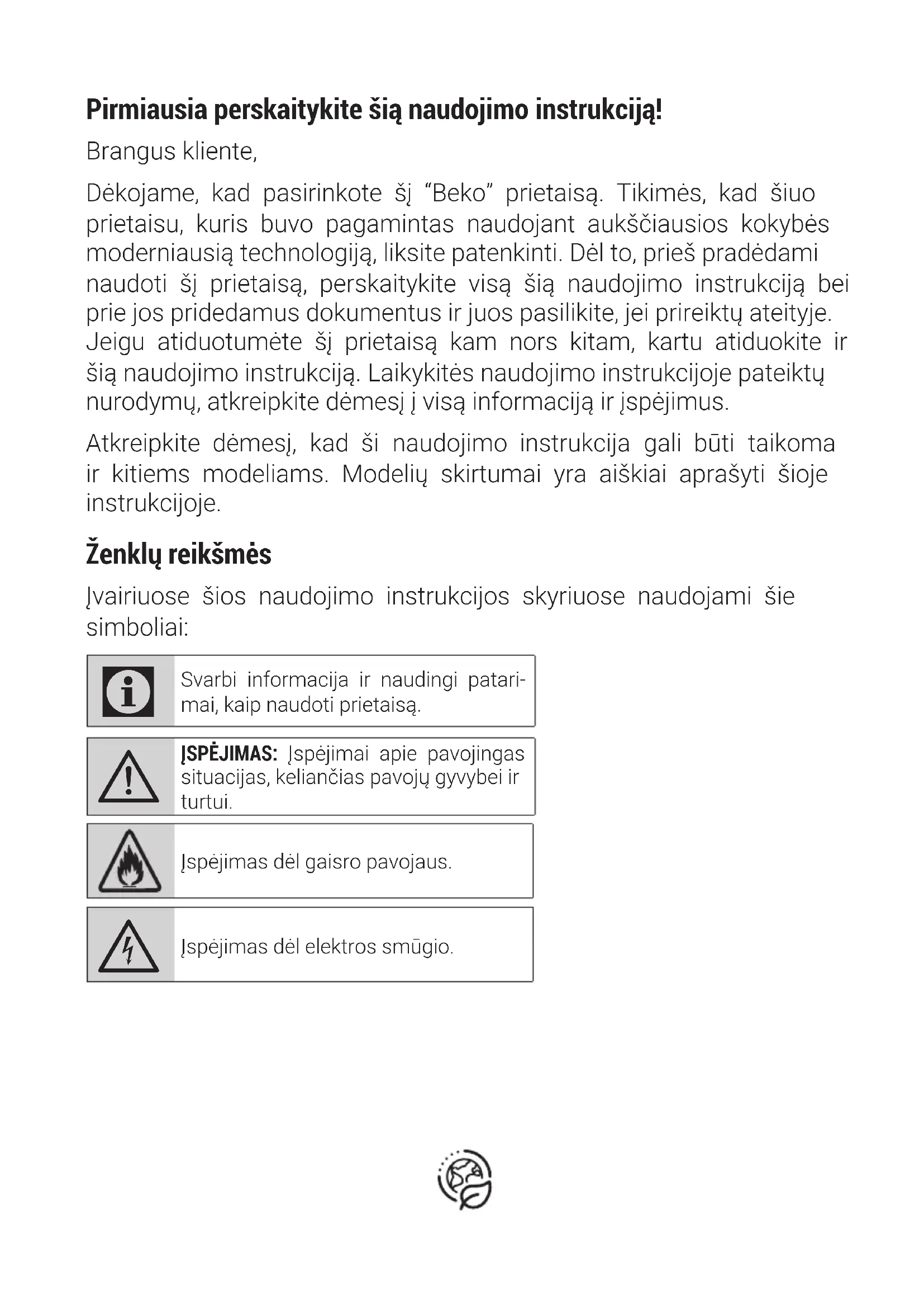 - „Beko“ gaminiai atitinka galiojančius saugos stan- dartus, todėl, jeigu prie- taisas arba jo maitinimo laidas būtų pažeistas, jį privalo paleisti platinto- jas, aptarnavimo centras ar specialistas arba bet kuris kitas įgaliotasis at- stovas, kad būtų išvengta bet kokių pavojų. Klaidingi arba netinkami remonto darbai gali kelti pavojų ir riziką vartotojui.