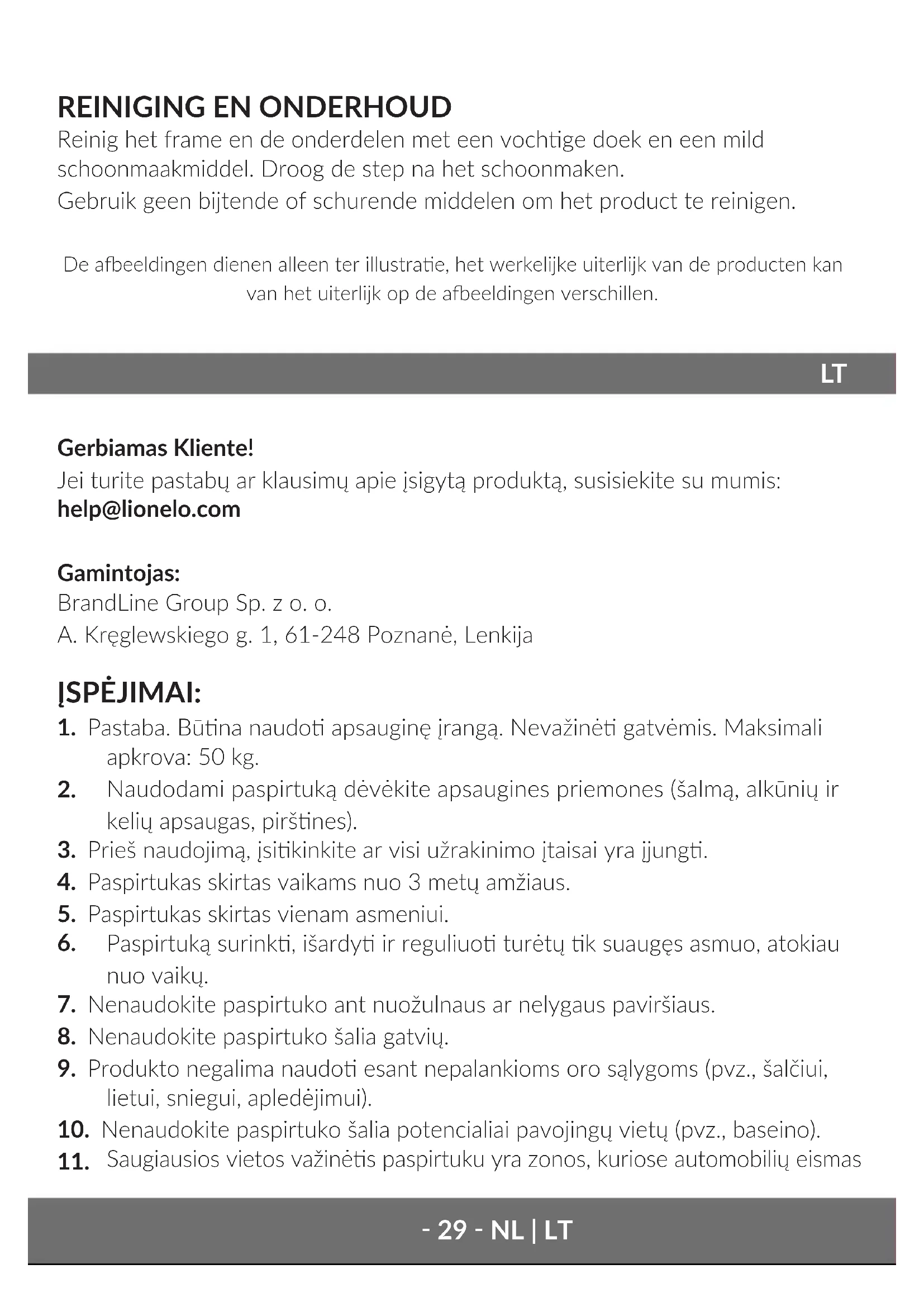 Gerbiamas Kliente! Jei turite pastabų ar klausimų apie įsigytą produktą, susisiekite su mumis: help@lionelo.com Gamintojas: BrandLine Group Sp. z o. o. A. Kręglewskiego g. 1, 61-248 Poznanė, Lenkija ĮSPĖJIMAI: