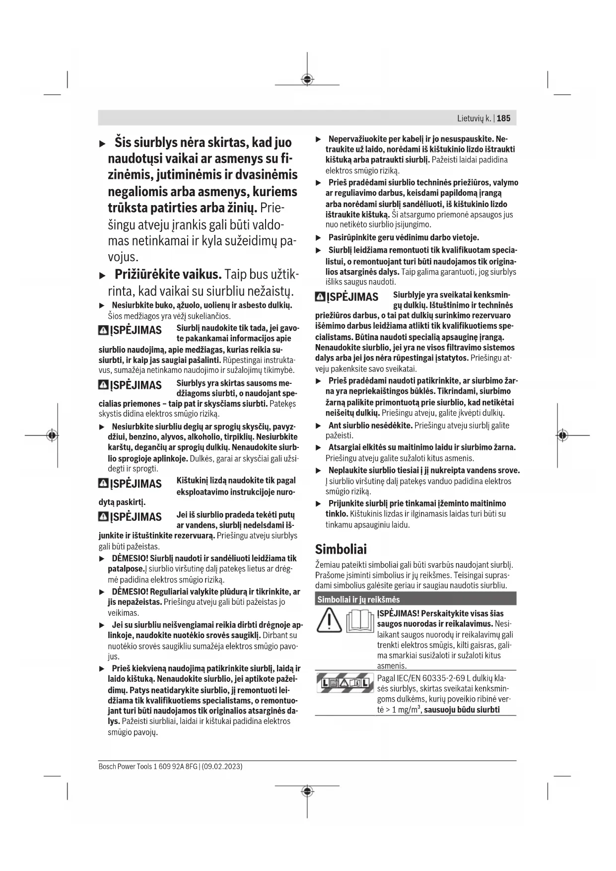 Sprogioje aplinkoje siurblį naudoti draudžiama. Kad užtikrintumėte optimalią siurbimo galią, nuo siurblio vir- šutinės dalies (6) visada nuvyniokite visą siurbimo žarną (17). Sausų dulkių siurbimas Nusėdusių dulkių nusiurbimas – Norėdami siurblįįjungti, paspauskite įjungimo-išjungimo mygtuką(4). – Norėdami siurblįišjungti, dar kartą paspauskite įjungimo- išjungimo mygtuką(4). Kylančių dulkių nusiurbimas nuo veikiančių elektrinių įrankių (žr.Epav.) u Jei panaudotas oras išleidžiamas atgal į patalpą, tai turi būti pakankama patalpos ventiliacijos norma (L). Laikykitės atitinkamų nacionalinių direktyvų. Dulkių siurblyje yra integruotas kištukinis lizdas su apsaugi- niu kontaktu(3). Prie jo galite prijungti išorinį elektrinį įra- nkį. Neviršykite maksimalios leistinos prijungto elektrinio įra- nkio suminės galios. – Uždėkite dulkių nusiurbimo adapterį(18). – Nusiurbimo adapterį(18) įstatykite į elektrinio įrankio nu- siurbimo atvamzdį. Nuoroda: dirbant su elektriniais įrankiais, kurių oro tiekimas į siurbimo žarną yra mažas (pvz., su siaurapjūkliais, šlifuok- liais ir pan.), reikia atidaryti papildomą oro angą(26), esan- čią ant nusiurbimo adapterio(18). Tik tada be problemų ga- lės veikti pusiau automatinė filtro valymo sistema (SFC). Tuo tikslu sukite žiedą, dengiantį papildomą oro angą(26), kol anga pasidarys maksimali. – Norėdami įjungti automatinį įjungimo ir išjungimo įtaisą, trumpai paspauskite įjungimo-išjungimo jungiklį(4). – Norėdami įjungti siurblį, įjunkite prie kištukinio lizdo(3) prijungtą elektrinį įrankį. Siurblys paleidžiamas automa- tiškai. – Norėdami baigti siurbti, išjunkite elektrinį įrankį. Kad iš siurbimo žarnos būtų išsiurbtos likusios dulkės, automatinio įjungimo ir išjungimo įtaiso veikimo iš inerci- jos funkcija dar veikia 15sekundes. – Norėdami siurblį išjungti, paspauskite įjungimo-išjungi- mo mygtuką(4). Skysčių siurbimas u Nesiurbkite siurbliu degių ar sprogių skysčių, pavyz- džiui, benzino, alyvos, alkoholio, tirpiklių. Nesiurbkite karštų, degančių ar sprogių dulkių. Nenaudokite siurb- lio sprogioje aplinkoje. Dulkės, garai ar skysčiai gali užsi- degti ir sprogti. u Siurblį draudžiama naudoti kaip vandens siurblį. Siurblys yra skirtas oro ir vandens mišiniui susiurbti. Darbo žingsniai prieš pradedant siurbti skysčius – Atspauskite užraktus (7) ir nuimkite siurblio viršutinę dalį (6). – Jei reikia, naudokite šalinimo maišelį(20) arba dulkių su- rinkimo maišelį. – Jei reikia, ištuštinkite rezervuarą(1). – Uždėkite siurblio viršutinę dalį (6) ir užspauskite užraktus (7). Skysčių siurbimas – Įjunkite siurblį. Siurblys yra su plūduru. Kai pasiekiamas maksimalus pripil- dymo aukštis, siurbimas sustabdomas. – Išjunkite siurblį. – Ištuštinkite rezervuarą(1). Siekiant išvengti pelėsių susidarymo po skysčių siurbimo: – Nuimkite siurblio viršutinę dalį(6), išimkite klostytą filtrą(28) ir palikite, kad viskas gerai išdžiūtų. Pusiau automatinė filtro valymo sistema (žr. F pav.) Vėliausiai tada, kai nebepakanka siurbimo našumo, reikia įjungti filtro valymo funkciją. 1 609 92A 8FG | (09.02.2023) Bosch Power ToolsLietuvių k. | 189 Filtro valymo dažnumas priklauso nuo dulkių rūšies ir kiekio. Reguliariai atliekant šią funkciją išlaikomas maksimalus našu- mas. Esant įjungtam pusiau automatiniam filtro valymui (SFC), grįžtantis oro srautas nuvalo ant filtro briaunų nusėdusias dulkes. Klostytas filtras su užterštu paviršiumi yra visiškai veiksmin- gas. Valyti klostyto filtro – jį stuksenant ar prapučiant – ne- būtina, taip darant jis netgi gali būti pažeistas. SFC filtro valymo paleidimas – Plaštaka uždenkite antgalio ar siurbimo žarnos angą. – 3 kartus paspauskite SFC jungiklį (11). Priežiūra ir servisas Priežiūra ir valymas u Prieš pradėdami siurblio techninės priežiūros, valymo ar reguliavimo darbus, keisdami papildomą įrangą arba norėdami siurblį sandėliuoti, iš kištukinio lizdo ištraukite kištuką. Ši atsargumo priemonė apsaugos jus nuo netikėto siurblio įsijungimo. u Kad galėtumėte gerai ir saugiai dirbti, pasirūpinkite, kad ventiliacinės angos ir siurblys būtų švarūs. u Atlikdami siurblio priežiūros ar valymo darbus, dėvė- kite respiratorių. Jei reikia pakeisti maitinimo laidą, dėl saugumo sumetimų tai turi būti atliekama Bosch įmonėje arba įgaliotose Bosch elektrinių įrankių remonto dirbtuvėse. Jei techninės priežiūros darbus atlieka naudotojas, siurblį reikia išmontuoti, išvalyti ir atlikti techninę priežiūrą, jei ją at- liekant nebus keliamas pavojus techninę priežiūrą atliekan- čiam personalui ar kitiems asmenims. Prieš išmontuojant siurblį reikia išvalyti, kad būtų išvengta galimų pavojų. Patal- pa, kurioje išmontuojamas siurblys, turi būti gerai vėdinama. Atlikdami techninės priežiūros darbus dėvėkite asmenines apsaugines priemones. Atlikus techninės priežiūros darbus reikia išvalyti techninės priežiūros zoną. Bent kartą metuose gamintojas ar įgaliotas asmuo privalo at- likti siurblio techninių savybių, susijusių su dulkių surinkimu, patikrinimą, pvz., ar nepažeistas filtras, ar siurblys sandarus, kaip veikia kontrolinis įtaisas. L klasės siurblius, kurie buvo užterštoje aplinkoje, reikia nu- valyti iš išorės, taip pat reikia nuvalyti arba apdoroti sandari- namosiomis medžiagomis visas mašinos dalis. Atliekant techninės priežiūros ir remonto darbus visas užterštas dalis, kurių nebegalima tinkamai išvalyti, reikia šalinti. Šias dalis reikia šalinti nepralaidžiuose maišeliuose, laikantis tokių at- liekų šalinimo taisyklių. – Retkarčiais nuvalykite siurblio korpusą drėgna šluoste. Konteinerio valymas – Konteinerį (1) retkarčiais išvalykite įprastu, neabrazyvi- niu valikli