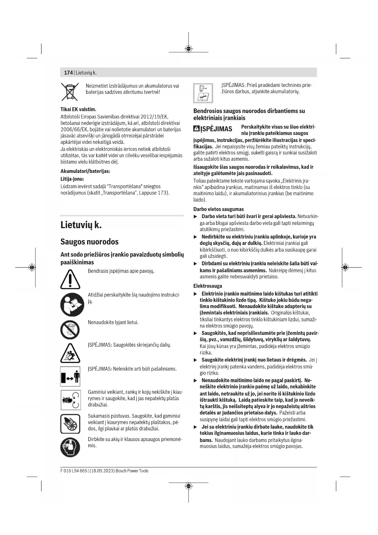 Simboli Tālāk aplūkoto simbolu nozīmi ir svarīgi zināt, lai varētu lasīt un pareizi izprast šo lietošanas pamācību. Iegaumējiet šos simbolus un to nozīmi. Simbolu pareiza interpretēšana palīdzēs Jums labāk un drošāk lietot izstrādājumu. Simbols Nozīme Kustības virziens Ieslēgšana Ieslēgšana Izslēgšana CLICK! Ir sadzirdams troksnis Piederumi Kļūmju uzmeklēšana Šeit sniegtajā tabulā ir apkopota informācija par iespējamajām kļūmēm instrumenta darbībā un par šo kļūmju novēršanu. Ja kļūmi neizdodas atklāt un novērst saviem spēkiem, griezieties pēc palīdzības tuvākajā remonta darbnīcā. Ievērībai: Pirms kļūmju uzmeklēšanas izslēdziet instrumentu. Ievērībai: negadījuma vai instrumenta salūšanas gadījumā nekavējoties apturiet iekārtu un izņemiet akumulatoru. Pazīme Iespējamais cēlonis Novēršana Dārza instruments nedarbojas Ir izlādējies akumulators Uzlādējiet akumulatoru Akumulators nav pareizi ievietots Ievietojiet akumulatoru pareizi (skatiet attēlu C) Akumulatora temperatūra ir pārāk zema vai pārāk augsta Nogaidiet, līdz akumulators sasilst vai atdziest. Vienmēr iedarbiniet izstrādājumu ar mazu apgriezienu skaitu F 016 L94 665 | (18.09.2023) Bosch Power ToolsLatviešu | 173 Pazīme Iespējamais cēlonis Novēršana Dārza instruments ir bojāts Griezieties klientu apkalpošanas uzņēmumā Dārza instruments darbojas ar pārtraukumiem Ir bojāts ieslēdzējs Vērsieties klientu apkalpošanas uzņēmumā Gaisa plūsmas ātruma regulators ir bojāts Vērsieties klientu apkalpošanas uzņēmumā Elektroinstruments stipri vibrē un/vai trokšņo Dārza instruments ir bojāts Griezieties klientu apkalpošanas uzņēmumā Darbības laiks ar vienu akumulatora uzlādi ir pārāk mazs Akumulators nav ilgi lietots vai arī ir lietots tikai neilgu laiku Akumulators ir pilnīgi uzlādēts Akumulators ir pilnībā pārstājis darboties vai tajā ir radies bojājums Nomainiet akumulatoru Dārza instruments neveido gaisa plūsmu Ir nosprostota sprausla Likvidējiet sprauslas nosprostojumu Samazināta gaisa plūsma Gaisa ievadatvere ir bloķēta Atbrīvojiet gaisa ievadatveri Akumulatora temperatūra ir pārāk zema Vienmēr iedarbiniet izstrādājumu ar mazu apgriezienu skaitu Sprauslu nav iespējams pievienot dārza instrumentam Dārza instruments ir nepareizi samontēts Uzstādiet sprauslu pareizi (skatiet attēlu B) Apkalpošana un apkope Apkalpošana, tīrīšana un uzglabāšana u Uzticiet savu izstrādājumu remontu vienīgi kvalificētiem speciālistiem, kas izmanto vienīgi oriģinālās rezerves daļas. Tādējādi ir garantēta nemainīga drošība. u Nekādā gadījumā neveiciet bojātu akumulatoru apkalpošanu. Akumulatoru apkalpošanu drīkst veikt tikai ražotājs vai tā pilnvaroti servisa speciālisti. Apkalpošana, tīrīšana un uzglabāšana Pirms izstrādājuma novietošanas uzglabāšanai apslaukiet to ar audumu. Tīrot un montējot sprauslu, pārliecinieties, ka dzinējs ir izslēgts un akumulators ir atvienots. Nekad neizmantojiet šķīdinātājus. Neapsmidziniet izstrādājumu ar ūdeni. Neiegremdējiet izstrādājumu ūdenī. Klientu apkalpošanas dienests un konsultācijas par lietošanu Klientu apkalpošanas dienests atbildēs uz Jūsu jautājumiem par izstrādājumu remontu un apkalpošanu, kā arī par to rezerves daļām. Kopsalikuma attēlus un informāciju par rezerves daļām Jūs varat atrast interneta vietnē: www.bosch-pt.com Bosch konsultantu grupa palīdzēs Jums vislabākajā veidā rast atbildes uz jautājumiem par mūsu izstrādājumiem un to piederumiem. Pieprasot konsultācijas un pasūtot rezerves daļas, noteikti paziņojiet 10zīmju izstrādājuma numuru, kas norādīts uz izstrādājuma marķējuma plāksnītes. Latvijas Republika Robert Bosch SIA Bosch elektroinstrumentu servisa centrs Mūkusalas ielā 97 LV-1004 Rīga Tālr.: 67146262 Telefakss: 67146263 E-pasts: service-pt@lv.bosch.com Papildu klientu apkalpošanas dienesta adreses skatiet šeit: www.bosch-pt.com/serviceaddresses Transportēšana Ieteicamajiem litija jonu akumulatoriem ir piemērojami Bīstamo kravu aprites likuma noteikumi. Lietotājs var transportēt akumulatorus ielu transporta plūsmā bez papildu nosacījumiem. Pārsūtot tos ar trešo personu starpniecību (piemēram, ar gaisa transporta vai citu transporta aģentūru starpniecību), jāievēro īpaši sūtījuma iesaiņošanas un marķēšanas noteikumi. Tāpēc sūtījumu sagatavošanas laikā jāpieaicina bīstamo kravu pārvadāšanas speciālists. Pārsūtiet akumulatoru tikai tad, ja tā korpuss nav bojāts. Aizlīmējiet vaļējos akumulatora kontaktus un iesaiņojiet akumulatoru tā, lai tas iesaiņojumā nepārvietotos. Lūdzam ievērot arī ar akumulatoru pārsūtīšanu saistītos nacionālos noteikumus, ja tādi pastāv. Atbrīvošanās no nolietotajiem izstrādājumiem Nolietotie izstrādājumi, akumulatori, piederumi un iesaiņojuma materiāli jāpakļauj otrreizējai pārstrādei apkārtējai videi nekaitīgā veidā. Bosch Power Tools F 016 L94 665 | (18.09.2023)174 | Lietuvių k. Neizmetiet izstrādājumus un akumulatorus vai baterijas sadzīves atkritumu tvertnē! Tikai EK valstīm. Atbilstoši Eiropas Savienības direktīvai 2012/19/EK, lietošanai nederīgie izstrādājum, kā arī, atbilstoši direktīvai 2006/66/EK, bojātie vai nolietotie akumulatori un baterijas jāsavāc atsevišķi un jānogādā otrreizējai pārstrādei apkārtējai videi nekaitīgā veidā. Ja elektriskās un elektroniskās ierīces netiek atbilstoši utilizētas, tās var kaitēt videi un cilvēku veselībai iespējamās bīstamo vielu klātbūtnes dēļ. Akumulatori/baterijas: Litija-jonu: Lūdzam ievērot sadaļā "Transportēšana" sniegtos norādījumus (skatīt „Transportēšana“, Lappuse173). Lietuvių k. Saugos nuorodos Ant sodo priežiūros įrankio pavaizduotų simbolių paaiškinimas Bendrasis įspėjimas apie pavojų. Atidž
