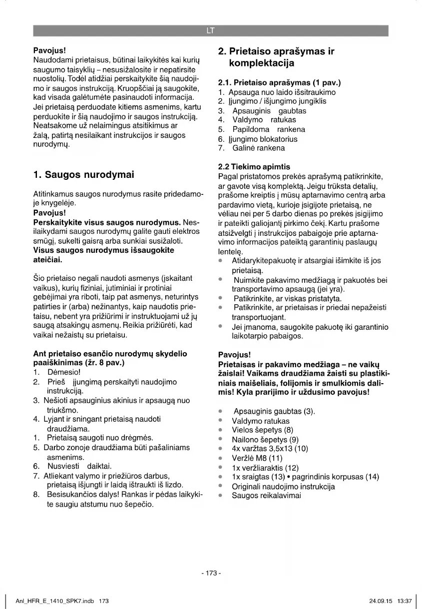 Tik ES šalims Elektros prietaisų neišmeskite kartu su buitinėmis atliekomis! Remiantis ES elektros ir elektronikos atliekų direktyva 2012/19/EB ir jos perkėlimu į nacionalinę teisinę bazę, panaudotus elektros prietaisus reikia surinkti ir perdirbti nekenkiant aplinkai. Perdirbimas - grąžinimo alternatyva: Elektros prietaiso savininkas įpareigotas negrąžinti pasirinktą prietaisą, bet tinkamai jį utilizuoti. Tuo tikslu elektros ir elektronikos atliekos gali būti perduotos atliekų tvarkymu užsiimančioms įmonėms, kurios jas utilizuoja remdamiesi nacionaliniu atliekų perdirbimo pramonės ir atliekų tvarkymo įstatymu. Šis reikalavimas netaikomas elektros prietaisuose panaudotiems priedams ir pagalbinėms priemonėms, kurių sudėtyje nėra elektros dalių. Perspausdinimas ar bet koks visų gaminio dokumentų visas ar dalinis dauginimas leidžiamas tik gavus aiškų iSC GmbH leidimą. Teisę atlikti techninius pakeitimus pasiliekame sau Anl_HFR_E_1410_SPK7.indb 177Anl_HFR_E_1410_SPK7.indb 177 24.09.15 13:3724.09.15 13:37LT