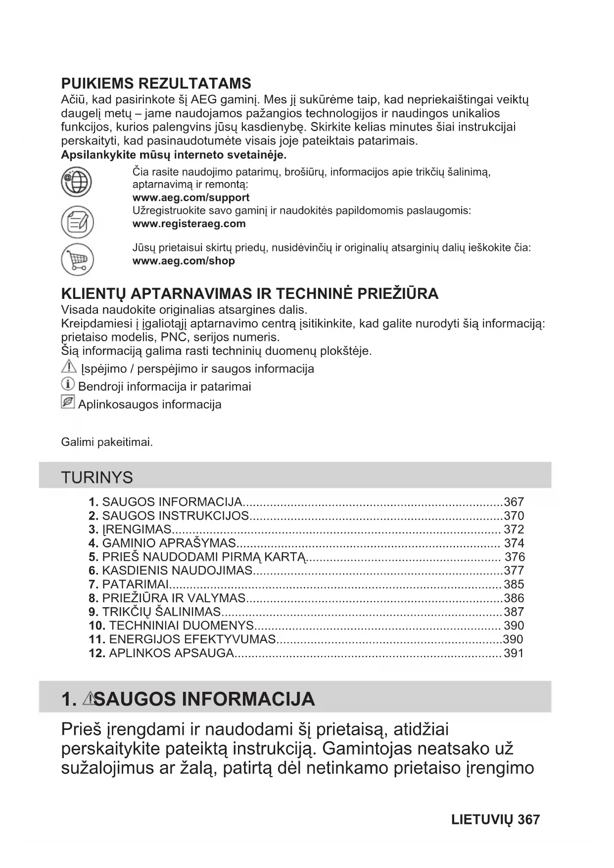 Ačiū, kad pasirinkote šį AEG gaminį. Mes jį sukūrėme taip, kad nepriekaištingai veiktųdaugelį metų – jame naudojamos pažangios technologijos ir naudingos unikaliosfunkcijos, kurios palengvins jūsų kasdienybę. Skirkite kelias minutes šiai instrukcijaiperskaityti, kad pasinaudotumėte visais joje pateiktais patarimais.Apsilankykite mūsų interneto svetainėje.Čia rasite naudojimo patarimų, brošiūrų, informacijos apie trikčių šalinimą,aptarnavimą ir remontą:www.aeg.com/supportUžregistruokite savo gaminį ir naudokitės papildomomis paslaugomis:www.registeraeg.comJūsų prietaisui skirtų priedų, nusidėvinčių ir originalių atsarginių dalių ieškokite čia:www.aeg.com/shop KLIENTŲ APTARNAVIMAS IR TECHNINĖ PRIEŽIŪRA Visada naudokite originalias atsargines dalis.Kreipdamiesi į įgaliotąjį aptarnavimo centrą įsitikinkite, kad galite nurodyti šią informaciją:prietaiso modelis, PNC, serijos numeris.Šią informaciją galima rasti techninių duomenų plokštėje. Įspėjimo / perspėjimo ir saugos informacija Bendroji informacija ir patarimai Aplinkosaugos informacijaGalimi pakeitimai. TURINYS