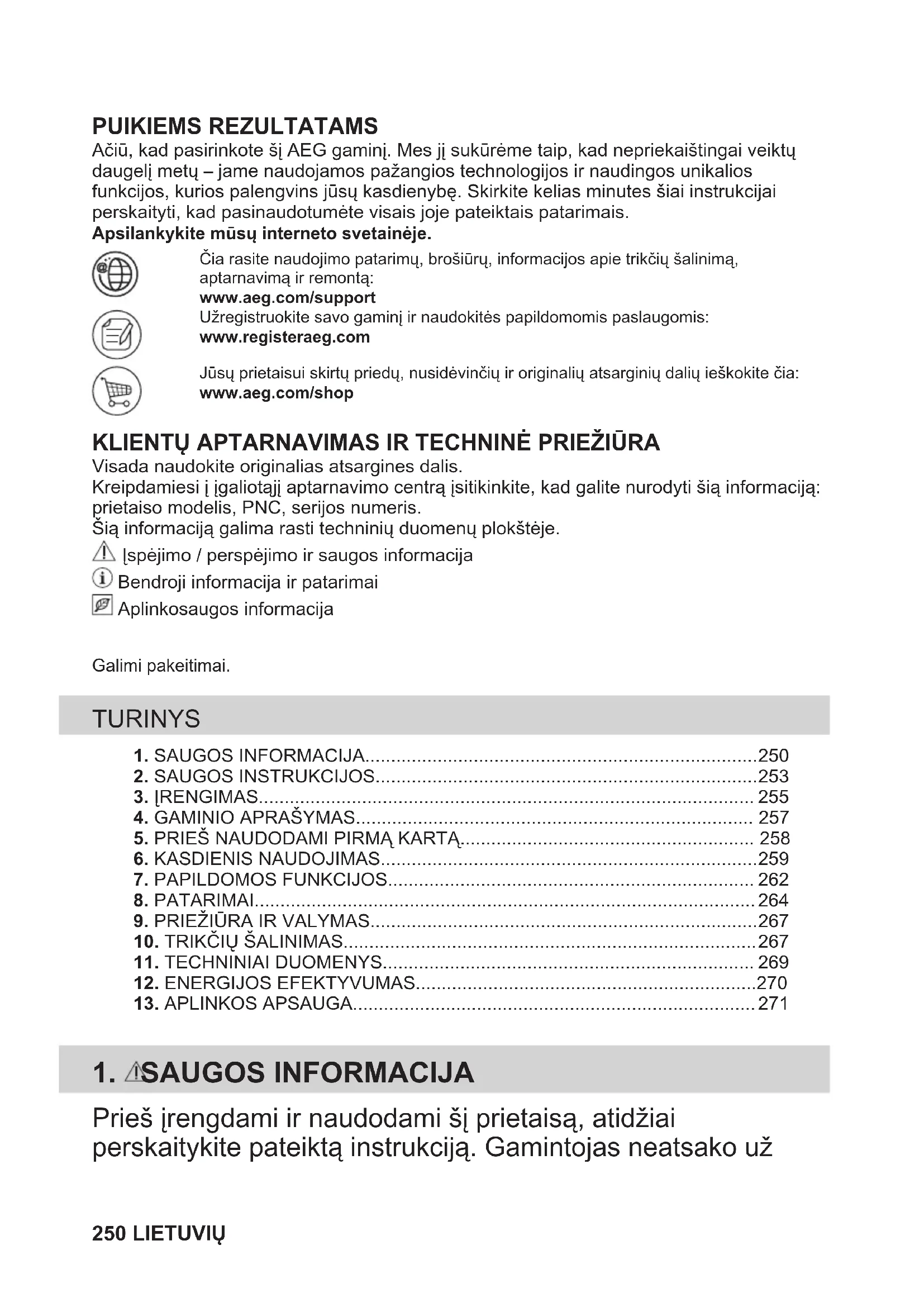 Ačiū, kad pasirinkote šį AEG gaminį. Mes jį sukūrėme taip, kad nepriekaištingai veiktųdaugelį metų – jame naudojamos pažangios technologijos ir naudingos unikaliosfunkcijos, kurios palengvins jūsų kasdienybę. Skirkite kelias minutes šiai instrukcijaiperskaityti, kad pasinaudotumėte visais joje pateiktais patarimais.Apsilankykite mūsų interneto svetainėje.Čia rasite naudojimo patarimų, brošiūrų, informacijos apie trikčių šalinimą,aptarnavimą ir remontą:www.aeg.com/supportUžregistruokite savo gaminį ir naudokitės papildomomis paslaugomis:www.registeraeg.comJūsų prietaisui skirtų priedų, nusidėvinčių ir originalių atsarginių dalių ieškokite čia:www.aeg.com/shop KLIENTŲ APTARNAVIMAS IR TECHNINĖ PRIEŽIŪRA Visada naudokite originalias atsargines dalis.Kreipdamiesi į įgaliotąjį aptarnavimo centrą įsitikinkite, kad galite nurodyti šią informaciją:prietaiso modelis, PNC, serijos numeris.Šią informaciją galima rasti techninių duomenų plokštėje. Įspėjimo / perspėjimo ir saugos informacija Bendroji informacija ir patarimai Aplinkosaugos informacijaGalimi pakeitimai. TURINYS