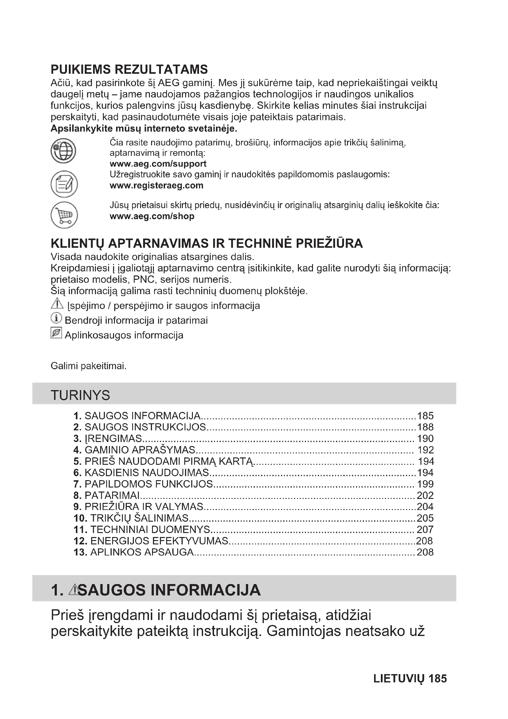 Ačiū, kad pasirinkote šį AEG gaminį. Mes jį sukūrėme taip, kad nepriekaištingai veiktųdaugelį metų – jame naudojamos pažangios technologijos ir naudingos unikaliosfunkcijos, kurios palengvins jūsų kasdienybę. Skirkite kelias minutes šiai instrukcijaiperskaityti, kad pasinaudotumėte visais joje pateiktais patarimais.Apsilankykite mūsų interneto svetainėje.Čia rasite naudojimo patarimų, brošiūrų, informacijos apie trikčių šalinimą,aptarnavimą ir remontą:www.aeg.com/supportUžregistruokite savo gaminį ir naudokitės papildomomis paslaugomis:www.registeraeg.comJūsų prietaisui skirtų priedų, nusidėvinčių ir originalių atsarginių dalių ieškokite čia:www.aeg.com/shop KLIENTŲ APTARNAVIMAS IR TECHNINĖ PRIEŽIŪRA Visada naudokite originalias atsargines dalis.Kreipdamiesi į įgaliotąjį aptarnavimo centrą įsitikinkite, kad galite nurodyti šią informaciją:prietaiso modelis, PNC, serijos numeris.Šią informaciją galima rasti techninių duomenų plokštėje. Įspėjimo / perspėjimo ir saugos informacija Bendroji informacija ir patarimai Aplinkosaugos informacijaGalimi pakeitimai. TURINYS