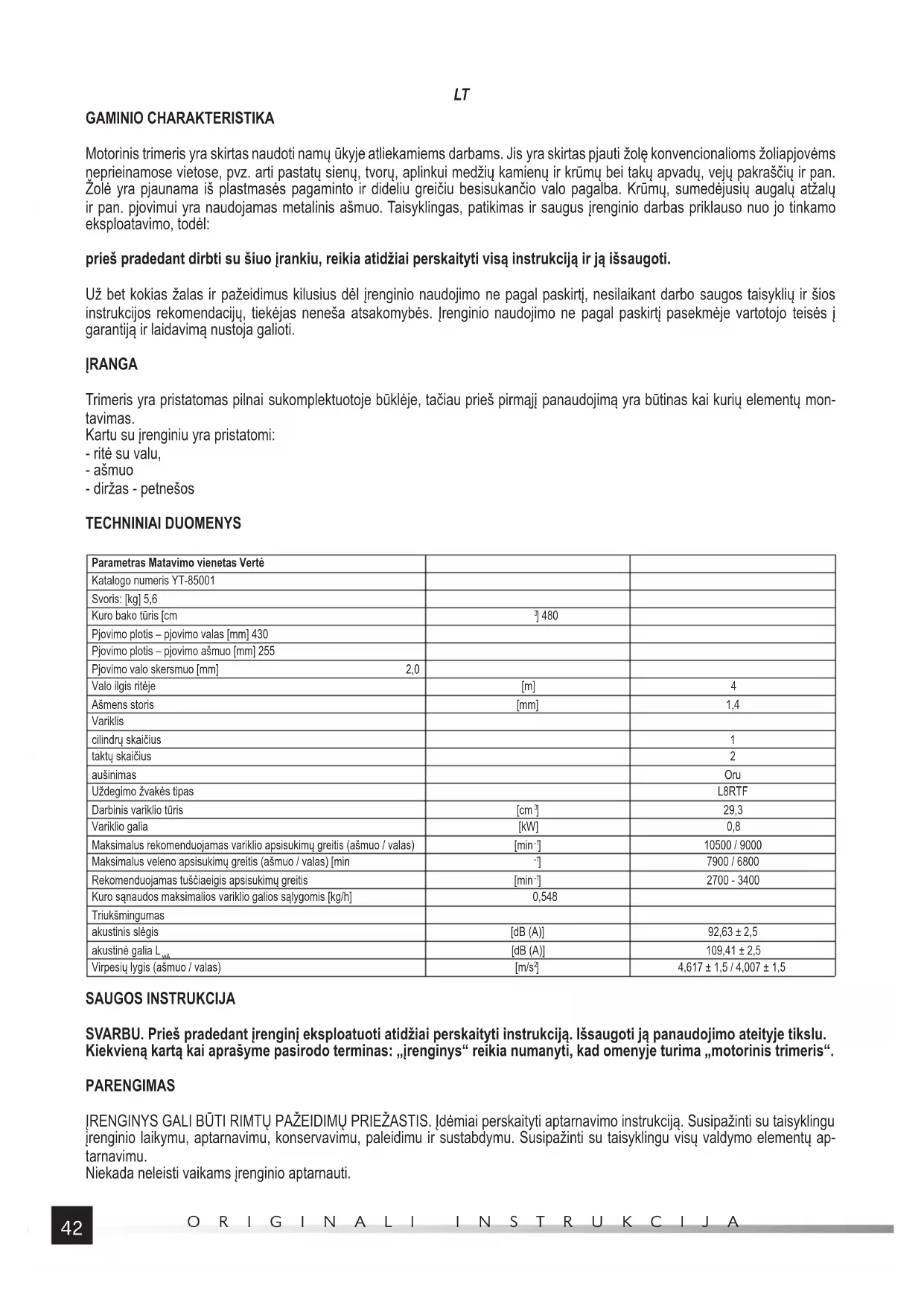 GAMINIO CHARAKTERISTIKA Motorinis trimeris yra skirtas naudoti namų ūkyje atliekamiems darbams. Jis yra skirtas pjauti žolę konvencionalioms žoliapjovėms neprieinamose vietose, pvz. arti pastatų sienų, tvorų, aplinkui medžių kamienų ir krūmų bei takų apvadų, vejų pakraščių ir pan. Žolė yra pjaunama iš plastmasės pagaminto ir dideliu greičiu besisukančio valo pagalba. Krūmų, sumedėjusių augalų atžalų ir pan. pjovimui yra naudojamas metalinis ašmuo. Taisyklingas, patikimas ir saugus įrenginio darbas priklauso nuo jo tinkamo eksploatavimo, todėl: prieš pradedant dirbti su šiuo įrankiu, reikia atidžiai perskaityti visą instrukciją ir ją išsaugoti. Už bet kokias žalas ir pažeidimus kilusius dėl įrenginio naudojimo ne pagal paskirtį, nesilaikant darbo saugos taisyklių ir šios instrukcijos rekomendacijų, tiekėjas neneša atsakomybės. Įrenginio naudojimo ne pagal paskirtį pasekmėje vartotojo teisės į garantiją ir laidavimą nustoja galioti. ĮRANGA Trimeris yra pristatomas pilnai sukomplektuotoje būklėje, tačiau prieš pirmąjį panaudojimą yra būtinas kai kurių elementų mon- tavimas. Kartu su įrenginiu yra pristatomi: - ritė su valu, - ašmuo - diržas - petnešos TECHNINIAI DUOMENYS Parametras Matavimo vienetas Vertė Katalogo numeris YT-85001 Svoris: [kg] 5,6 Kuro bako tūris [cm