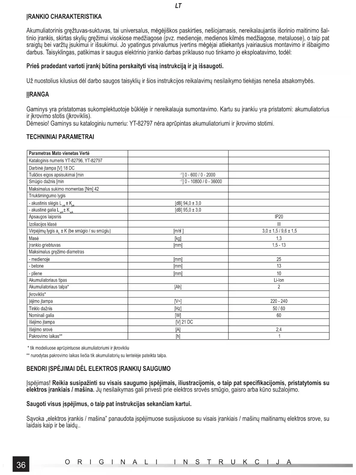 ĮRANKIO CHARAKTERISTIKA Akumuliatorinis gręžtuvas-suktuvas, tai universalus, mėgėjiškos paskirties, nešiojamasis, nereikalaujantis išorinio maitinimo šal- tinio įrankis, skirtas skylių gręžimui visokiose medžiagose (pvz. medienoje, medienos kilmės medžiagose, metaluose), o taip pat sraigtų bei varžtų įsukimui ir išsukimui. Jo ypatingus privalumus įvertins mėgėjai atliekantys įvairiausius montavimo ir išbaigimo darbus. Taisyklingas, patikimas ir saugus elektrinio įrankio darbas priklauso nuo tinkamo jo eksploatavimo, todėl: Prieš pradedant vartoti įrankį būtina perskaityti visą instrukciją ir ją išsaugoti. Už nuostolius kilusius dėl darbo saugos taisyklių ir šios instrukcijos reikalavimų nesilaikymo tiekėjas neneša atsakomybės. ĮĮRANGA Gaminys yra pristatomas sukomplektuotoje būklėje ir nereikalauja sumontavimo. Kartu su įrankiu yra pristatomi: akumuliatorius ir įkrovimo stotis (įkroviklis). Dėmesio! Gaminys su kataloginiu numeriu: YT-82797 nėra aprūpintas akumuliatoriumi ir įkrovimo stotimi. TECHNINIAI PARAMETRAI Parametras Mato vienetas Vertė Kataloginis numeris YT-82796, YT-82797 Darbinė įtampa [V] 18 DC Tuščios eigos apsisukimai [min