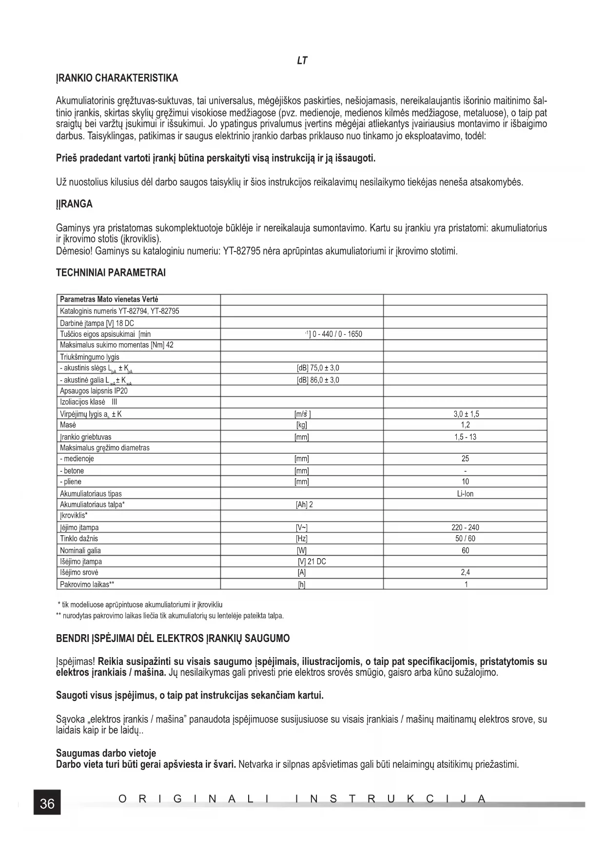 ĮRANKIO CHARAKTERISTIKA Akumuliatorinis gręžtuvas-suktuvas, tai universalus, mėgėjiškos paskirties, nešiojamasis, nereikalaujantis išorinio maitinimo šal- tinio įrankis, skirtas skylių gręžimui visokiose medžiagose (pvz. medienoje, medienos kilmės medžiagose, metaluose), o taip pat sraigtų bei varžtų įsukimui ir išsukimui. Jo ypatingus privalumus įvertins mėgėjai atliekantys įvairiausius montavimo ir išbaigimo darbus. Taisyklingas, patikimas ir saugus elektrinio įrankio darbas priklauso nuo tinkamo jo eksploatavimo, todėl: Prieš pradedant vartoti įrankį būtina perskaityti visą instrukciją ir ją išsaugoti. Už nuostolius kilusius dėl darbo saugos taisyklių ir šios instrukcijos reikalavimų nesilaikymo tiekėjas neneša atsakomybės. ĮĮRANGA Gaminys yra pristatomas sukomplektuotoje būklėje ir nereikalauja sumontavimo. Kartu su įrankiu yra pristatomi: akumuliatorius ir įkrovimo stotis (įkroviklis). Dėmesio! Gaminys su kataloginiu numeriu: YT-82795 nėra aprūpintas akumuliatoriumi ir įkrovimo stotimi. TECHNINIAI PARAMETRAI Parametras Mato vienetas Vertė Kataloginis numeris YT-82794, YT-82795 Darbinė įtampa [V] 18 DC Tuščios eigos apsisukimai [min