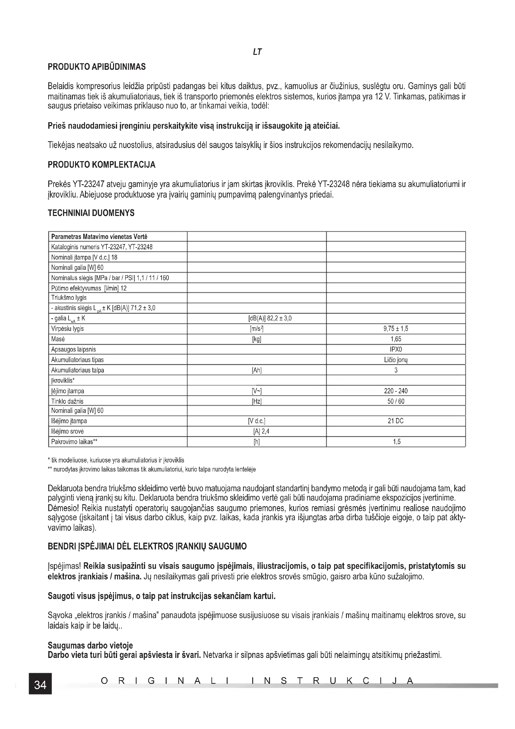 Belaidis kompresorius leidžia pripūsti padangas bei kitus daiktus, pvz., kamuolius ar čiužinius, suslėgtu oru. Gaminys gali būti maitinamas tiek iš akumuliatoriaus, tiek iš transporto priemonės elektros sistemos, kurios įtampa yra 12 V. Tinkamas, patikimas ir saugus prietaiso veikimas priklauso nuo to, ar tinkamai veikia, todėl: Prieš naudodamiesi įrenginiu perskaitykite visą instrukciją ir išsaugokite ją ateičiai. Tiekėjas neatsako už nuostolius, atsiradusius dėl saugos taisyklių ir šios instrukcijos rekomendacijų nesilaikymo. PRODUKTO KOMPLEKTACIJA Prekės YT-23247 atveju gaminyje yra akumuliatorius ir jam skirtas įkroviklis. Prekė YT-23248 nėra tiekiama su akumuliatoriumi ir įkrovikliu. Abiejuose produktuose yra įvairių gaminių pumpavimą palengvinantys priedai. TECHNINIAI DUOMENYS Parametras Matavimo vienetas Vertė Kataloginis numeris YT-23247, YT-23248 Nominali įtampa [V d.c.] 18 Nominali galia [W] 60 Nominalus slėgis [MPa / bar / PSI] 1,1 / 11 / 160 Pūtimo efektyvumas [l/min] 12 Triukšmo lygis - akustinis slėgis L