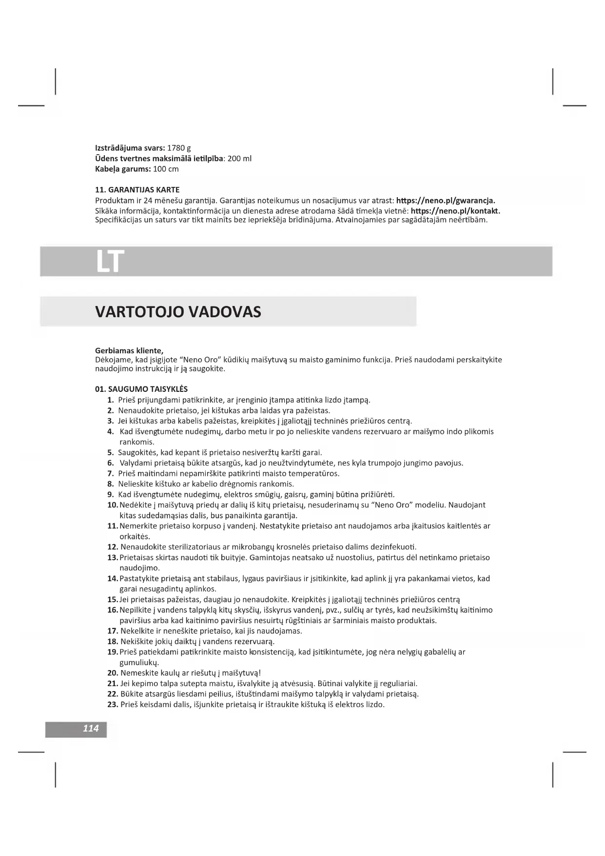 Produktui suteikiama 24 mėnesių garanja. Garanjos sąlygas rasite adresu: hps://neno.pl/gwarancja. Išsamią informaciją, kontaknius duomenis ir paslaugų teikimo adresą rasite adresu: hps://neno.pl/kontakt. Specikacijos ir turinys gali bū keičiami be išanksnio įspėjimo. Atsiprašome už nepatogumus.