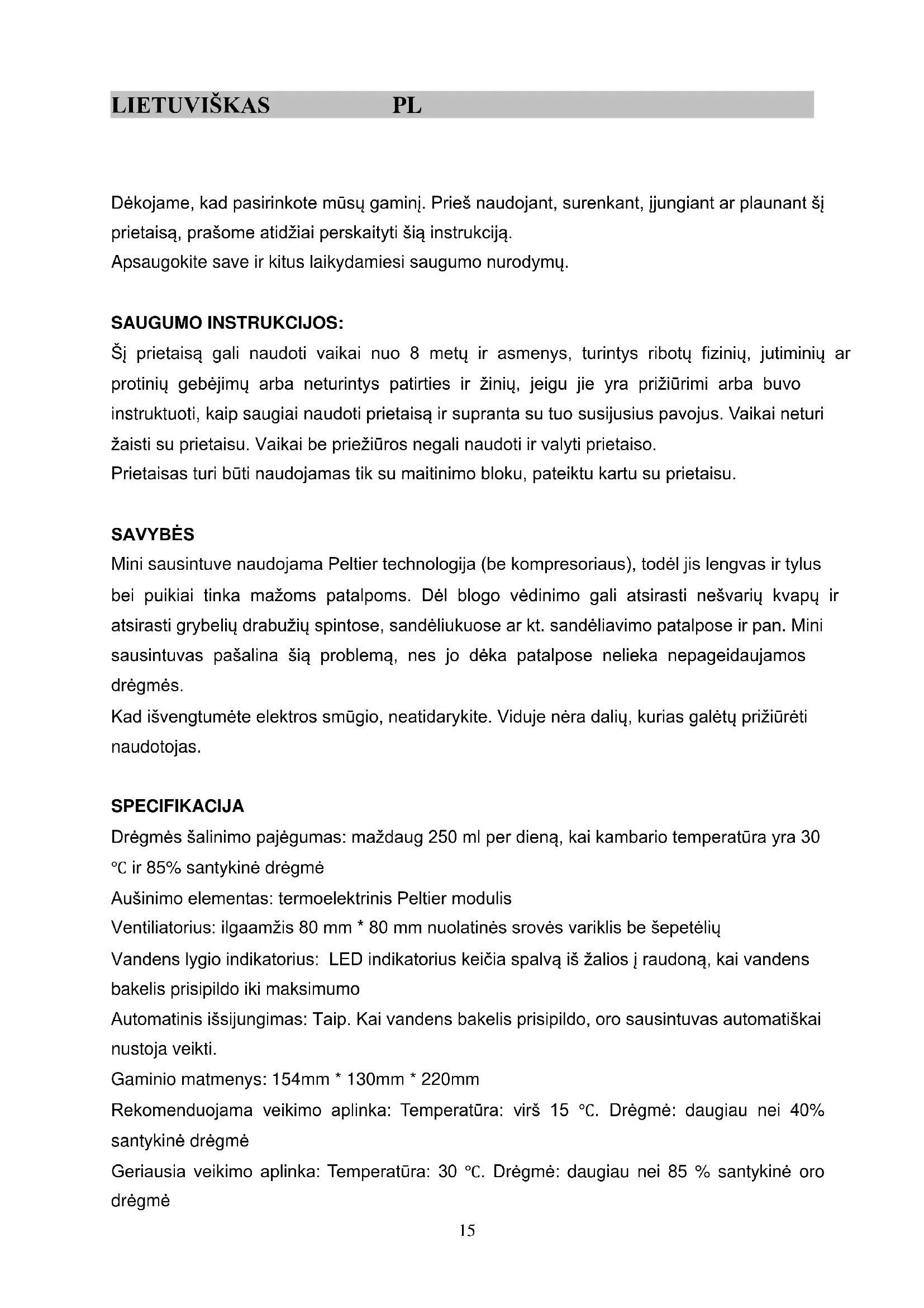Dėkojame, kad pasirinkote mūsų gaminį. Prieš naudojant, surenkant, įjungiant ar plaunant šį prietaisą, prašome atidžiai perskaityti šią instrukciją. Apsaugokite save ir kitus laikydamiesi saugumo nurodymų. SAUGUMO INSTRUKCIJOS: Šį prietaisą gali naudoti vaikai nuo 8 metų ir asmenys, turintys ribotų fizinių, jutiminių ar protinių gebėjimų arba neturintys patirties ir žinių, jeigu jie yra prižiūrimi arba buvo instruktuoti, kaip saugiai naudoti prietaisą ir supranta su tuo susijusius pavojus. Vaikai neturi žaisti su prietaisu. Vaikai be priežiūros negali naudoti ir valyti prietaiso. Prietaisas turi būti naudojamas tik su maitinimo bloku, pateiktu kartu su prietaisu. SAVYBĖS Mini sausintuve naudojama Peltier technologija (be kompresoriaus), todėl jis lengvas ir tylus bei puikiai tinka mažoms patalpoms. Dėl blogo vėdinimo gali atsirasti nešvarių kvapų ir atsirasti grybelių drabužių spintose, sandėliukuose ar kt. sandėliavimo patalpose ir pan. Mini sausintuvas pašalina šią problemą, nes jo dėka patalpose nelieka nepageidaujamos drėgmės. Kad išvengtumėte elektros smūgio, neatidarykite. Viduje nėra dalių, kurias galėtų prižiūrėti naudotojas. SPECIFIKACIJA Drėgmės šalinimo pajėgumas: maždaug 250 ml per dieną, kai kambario temperatūra yra 30 ℃ ir 85% santykinė drėgmė Aušinimo elementas: termoelektrinis Peltier modulis Ventiliatorius: ilgaamžis 80 mm * 80 mm nuolatinės srovės variklis be šepetėlių Vandens lygio indikatorius: LED indikatorius keičia spalvą iš žalios į raudoną, kai vandens bakelis prisipildo iki maksimumo Automatinis išsijungimas: Taip. Kai vandens bakelis prisipildo, oro sausintuvas automatiškai nustoja veikti. Gaminio matmenys: 154mm * 130mm * 220mm Rekomenduojama veikimo aplinka: Temperatūra: virš 15 ℃. Drėgmė: daugiau nei 40% santykinė drėgmė Geriausia veikimo aplinka: Temperatūra: 30 ℃. Drėgmė: daugiau nei 85 % santykinė oro drėgmė16 AC/DC MAITINIMO ADAPTERIS ĮKAIS NAUDOJIMO METU. TAI NORMALU IR NEREIŠKIA, KAD PRIETAISAS SUGEDO.