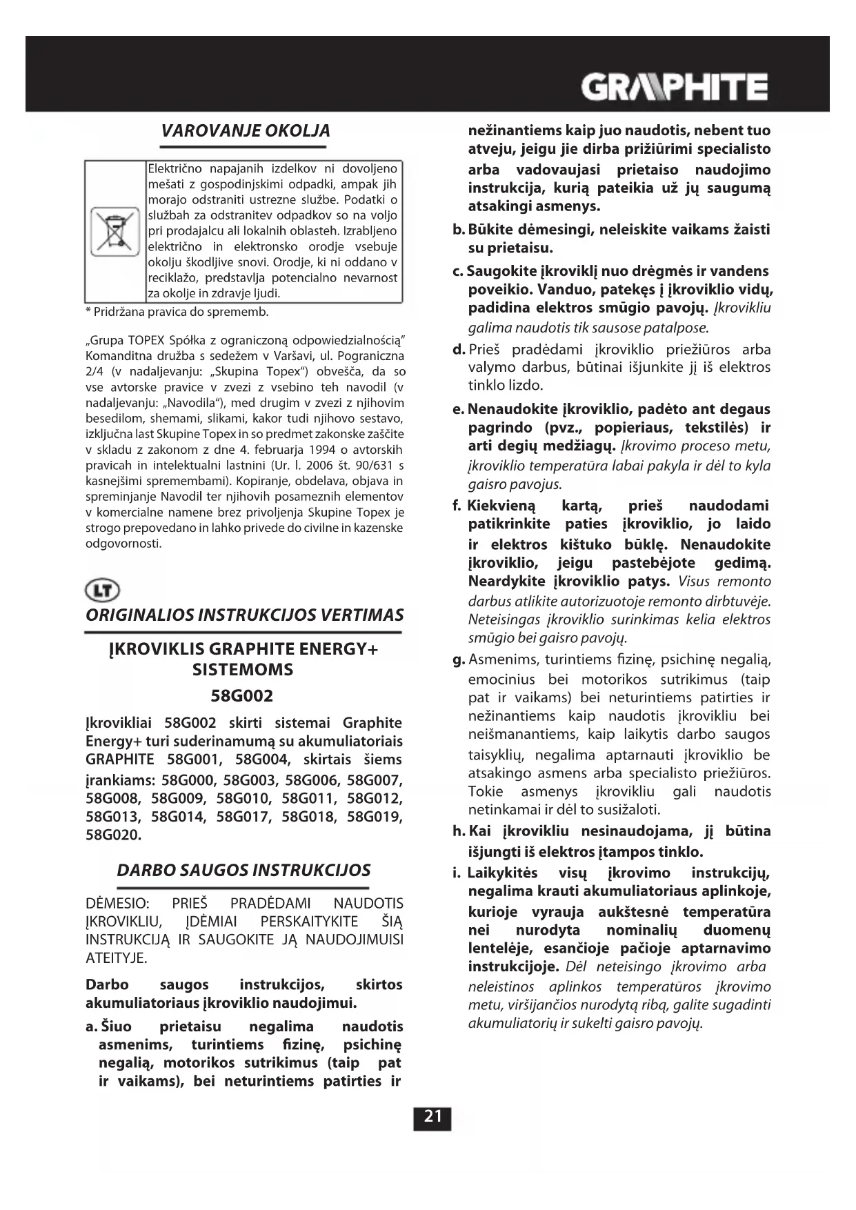 negalima krauti akumuliatoriaus aplinkoje, kurioje vyrauja aukštesnė temperatūra nei nurodyta nominalių duomenų lentelėje, esančioje pačioje aptarnavimo instrukcijoje. Dėl neteisingo įkrovimo arba neleistinos aplinkos temperatūros įkrovimo metu, viršijančios nurodytą ribą, galite sugadinti akumuliatorių ir sukelti gaisro pavojų.22 Remontas: a. Sugedusio įkroviklio neremontuokite patys. Visus remonto darbus gali atlikti tik gamintojas arba kvalikuotas autorizuos remonto dirbtuvės personalas. b. Susidėvėjusį įkroviklį nuneškite į specialų, už šio tipo pavojingų atliekų utilizavimą atsakingą surinkimo punktą. PANAUDOTŲ GRAFINIŲ ŽENKLŲ PAAIŠKINIMAS.