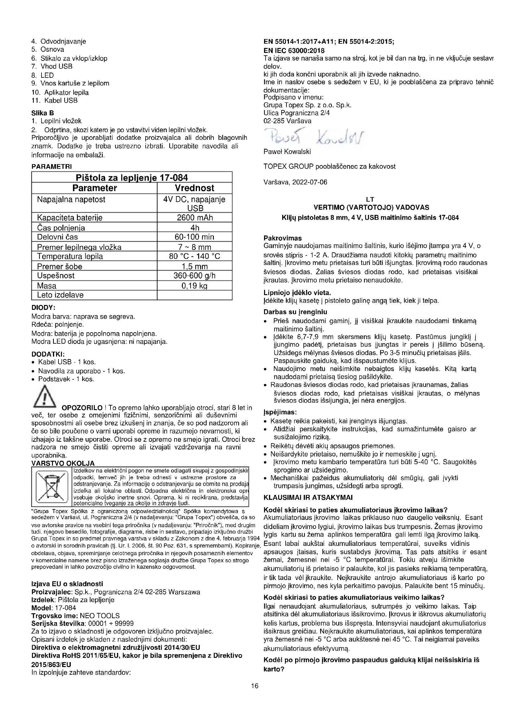 Elektra varomų gaminių negalima išmesti kartu su buitinėmis atliekomis, juos reikia pristatyti į atitinkamas utilizavimo vietas. Dėl informacijos apie šalinimą kreipkitės į gaminio pardavėją arba vietos valdžios instituciją. Elektros ir elektroninės įrangos atliekose yra ekologiškai inertinių medžiagų. Neperdirbta įranga kelia potencialų pavojų aplinkai ir žmonių sveikatai. "Grupa Topex Spółka z ograniczoną odpowiedzialnością" "Spółka komandytowa", kurios registruota buveinė yra Varšuvoje, ul. Pograniczna 2/4 (toliau - "Grupa Topex") informuoja, kad visos autorių teisės į šio vadovo (toliau - "Vadovas") turinį, įskaitant, be kita ko. jo tekstą, nuotraukas, diagramas, brėžinius, taip pat jo kompoziciją, priklauso tik "Grupa Topex" ir yra teisinės apsaugos objektas pagal 1994 m. vasario 4 d. Autorių teisių ir gretutinių teisių įstatymą (t. y. 2006 m. Įstatymų leidinys Nr. 90 Poz. 631 su pakeitimais). Viso Vadovo ir atskirų jo elementų kopijavimas, apdorojimas, skelbimas, keitimas komerciniais tikslais be "Grupa Topex" raštu išreikšto sutikimo yra griežtai draudžiamas ir gali užtraukti civilinę ir baudžiamąją atsakomybę. ES atitikties deklaracija Gamintojas: Sp.k., Pograniczna 2/4 02-285 Warszawa Produktas: Klijų pistoletas Modelis: 17-084 Prekybos pavadinimas: NEO TOOLS Serijos numeris: 00001 ÷ 99999 Už šią atitikties deklaraciją atsako tik gamintojas. Pirmiau aprašytas gaminys atitinka šiuos dokumentus: Elektromagnetinio suderinamumo direktyva 2014/30/ES RoHS direktyva 2011/65/ES su pakeitimais, padarytais Direktyva 2015/863/ES Ir atitinka standartų reikalavimus: EN 55014-1:2017+A11; EN 55014-2:2015; EN IEC 63000:2018 Ši deklaracija taikoma tik tokioms mašinoms, kokios jos pateikiamos į rinką, ir neapima sudedamųjų dalių. prideda galutinis naudotojas arba atlieka vėliau. ES reziduojančio asmens, įgalioto rengti techninę dokumentaciją, vardas, pavardė ir adresas: Pasirašyta: Grupa Topex Sp. z o.o. Sp.k. Pograniczna gatvė 2/4 02-285 Varšuva Paweł Kowalski TOPEX GROUP kokybės pareigūnas Varšuva, 2022-07-0618