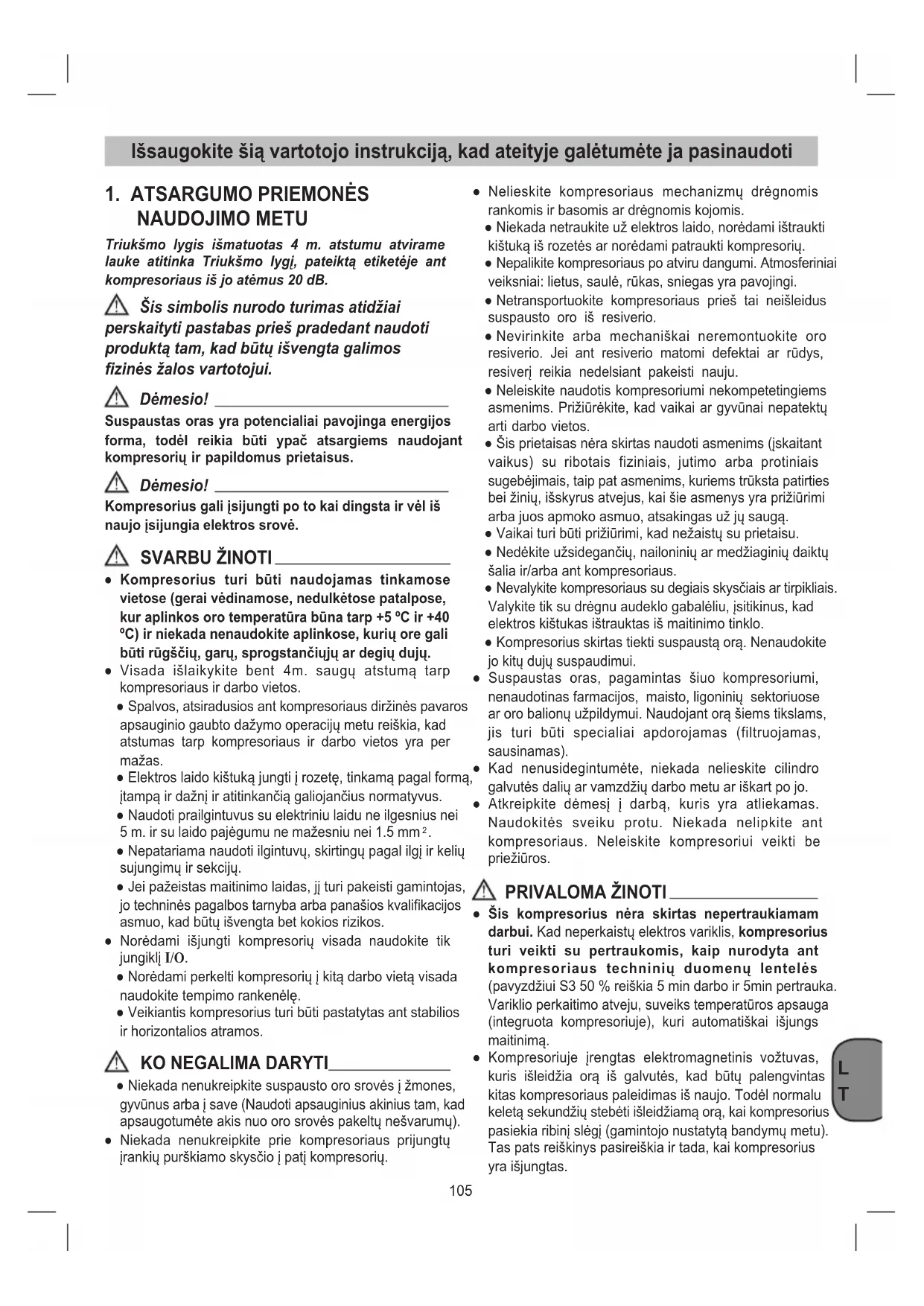 ● Niekada nenukreipkite suspausto oro srovės į žmones, gyvūnus arba į save (Naudoti apsauginius akinius tam, kad apsaugotumėte akis nuo oro srovės pakeltų nešvarumų). ● Niekada nenukreipkite prie kompresoriaus prijungtų įrankių purškiamo skysčio į patį kompresorių. ● Nelieskite kompresoriaus mechanizmų drėgnomis rankomis ir basomis ar drėgnomis kojomis. ● Niekada netraukite už elektros laido, norėdami ištraukti kištuką iš rozetės ar norėdami patraukti kompresorių. ● Nepalikite kompresoriaus po atviru dangumi. Atmosferiniai veiksniai: lietus, saulė, rūkas, sniegas yra pavojingi. ● Netransportuokite kompresoriaus prieš tai neišleidus suspausto oro iš resiverio. ● Nevirinkite arba mechaniškai neremontuokite oro resiverio. Jei ant resiverio matomi defektai ar rūdys, resiverį reikia nedelsiant pakeisti nauju. ● Neleiskite naudotis kompresoriumi nekompetetingiems asmenims. Prižiūrėkite, kad vaikai ar gyvūnai nepatektų arti darbo vietos. ● Šis prietaisas nėra skirtas naudoti asmenims (įskaitant vaikus) su ribotais fiziniais, jutimo arba protiniais sugebėjimais, taip pat asmenims, kuriems trūksta patirties bei žinių, išskyrus atvejus, kai šie asmenys yra prižiūrimi arba juos apmoko asmuo, atsakingas už jų saugą. ● Vaikai turi būti prižiūrimi, kad nežaistų su prietaisu. ● Nedėkite užsidegančių, nailoninių ar medžiaginių daiktų šalia ir/arba ant kompresoriaus. ● Nevalykite kompresoriaus su degiais skysčiais ar tirpikliais. Valykite tik su drėgnu audeklo gabalėliu, įsitikinus, kad elektros kištukas ištrauktas iš maitinimo tinklo. ● Kompresorius skirtas tiekti suspaustą orą. Nenaudokite jo kitų dujų suspaudimui. ● Suspaustas oras, pagamintas šiuo kompresoriumi, nenaudotinas farmacijos, maisto, ligoninių sektoriuose ar oro balionų užpildymui. Naudojant orą šiems tikslams, jis turi būti specialiai apdorojamas (filtruojamas, sausinamas). ● Kad nenusidegintumėte, niekada nelieskite cilindro galvutės dalių ar vamzdžių darbo metu ar iškart po jo. ● Atkreipkite dėmesį į darbą, kuris yra atliekamas. Naudokitės sveiku protu. Niekada nelipkite ant kompresoriaus. Neleiskite kompresoriui veikti be priežiūros. PRIVALOMA ŽINOTI ● Šis kompresorius nėra skirtas nepertraukiamam darbui. Kad neperkaistų elektros variklis, kompresorius turi veikti su pertraukomis, kaip nurodyta ant kompresoriaus techninių duomenų lentelės (pavyzdžiui S3 50 % reiškia 5 min darbo ir 5min pertrauka. Variklio perkaitimo atveju, suveiks temperatūros apsauga (integruota kompresoriuje), kuri automatiškai išjungs maitinimą. ● Kompresoriuje įrengtas elektromagnetinis vožtuvas, kuris išleidžia orą iš galvutės, kad būtų palengvintas kitas kompresoriaus paleidimas iš naujo. Todėl normalu keletą sekundžių stebėti išleidžiamą orą, kai kompresorius pasiekia ribinį slėgį (gamintojo nustatytą bandymų metu). Tas pats reiškinys pasireiškia ir tada, kai kompresorius yra išjungtas.106