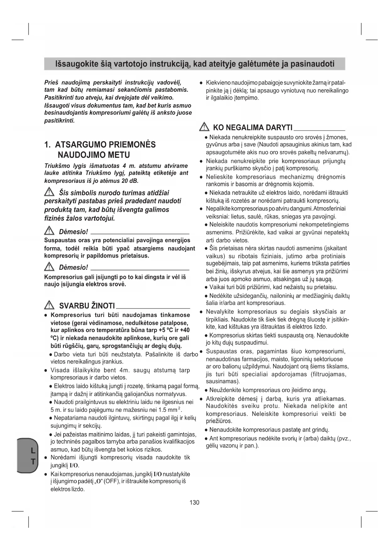 NAUDOJIMO METU Triukšmo lygis išmatuotas 4 m. atstumu atvirame lauke atitinka Triukšmo lygį, pateiktą etiketėje ant kompresoriaus iš jo atėmus 20 dB. Šis simbolis nurodo turimas atidžiai perskaityti pastabas prieš pradedant naudoti produktą tam, kad būtų išvengta galimos zinės žalos vartotojui. Dėmesio! Suspaustas oras yra potencialiai pavojinga energijos forma, todėl reikia būti ypač atsargiems naudojant kompresorių ir papildomus prietaisus. Dėmesio! Kompresorius gali įsijungti po to kai dingsta ir vėl iš naujo įsijungia elektros srovė. SVARBU ŽINOTI ● Kompresorius turi būti naudojamas tinkamose vietose (gerai vėdinamose, nedulkėtose patalpose, kur aplinkos oro temperatūra būna tarp +5 ºC ir +40 ºC) ir niekada nenaudokite aplinkose, kurių ore gali būti rūgščių, garų, sprogstančiųjų ar degių dujų. ● Darbo vieta turi būti neužstatyta. Pašalinkite iš darbo vietos nereikalingus įrankius. ● Visada išlaikykite bent 4m. saugų atstumą tarp kompresoriaus ir darbo vietos. ● Elektros laido kištuką jungti į rozetę, tinkamą pagal formą, įtampą ir dažnį ir atitinkančią galiojančius normatyvus. ● Naudoti prailgintuvus su elektriniu laidu ne ilgesnius nei 5 m. ir su laido pajėgumu ne mažesniu nei 1.5 mm
