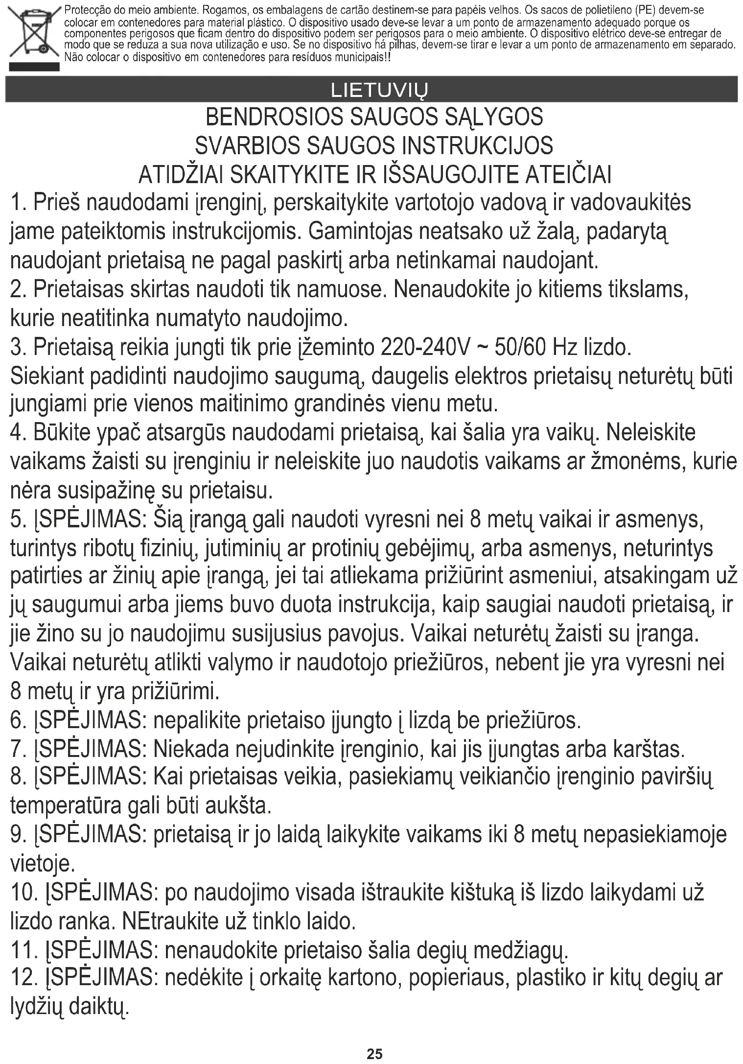 LATVIEŠU Rūpinantis aplinka. Kartono pakuotes atiduoti į makulatūrą. Polietileno (PE) maišelius mesti į plastikui skirtą konteinerį. Susidėvėjusį prietaisą atiduoti į atitinkamą atliekų surinkimo vietą, nes prietaise esančios pavojingos medžiagos gali kelti grėsmę aplinkai. Elektrinį prietaisą atiduoti tokį, kad nebūtų galima jo pakartotinai naudoti ir panaudoti. Jeigu prietaise yra baterijos, būtina jas išimti ir atskirai atiduoti į atliekų surinkimo vietą. Nemesti prietaiso į buitinių atliekų konteinerį!