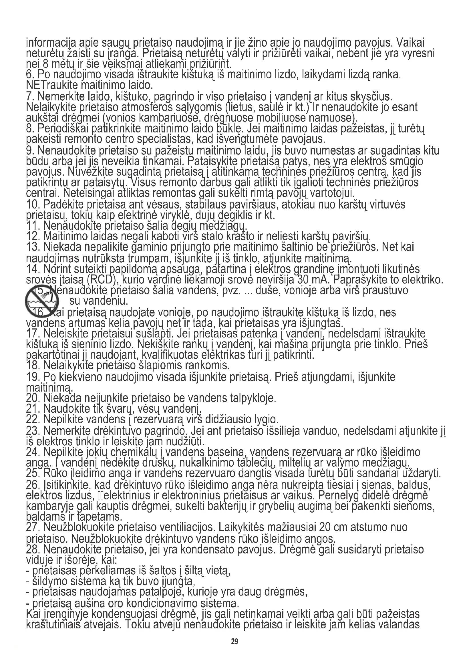 15. Nenaudokite prietaiso šalia vandens, pvz. ... duše, vonioje arba virš praustuvo